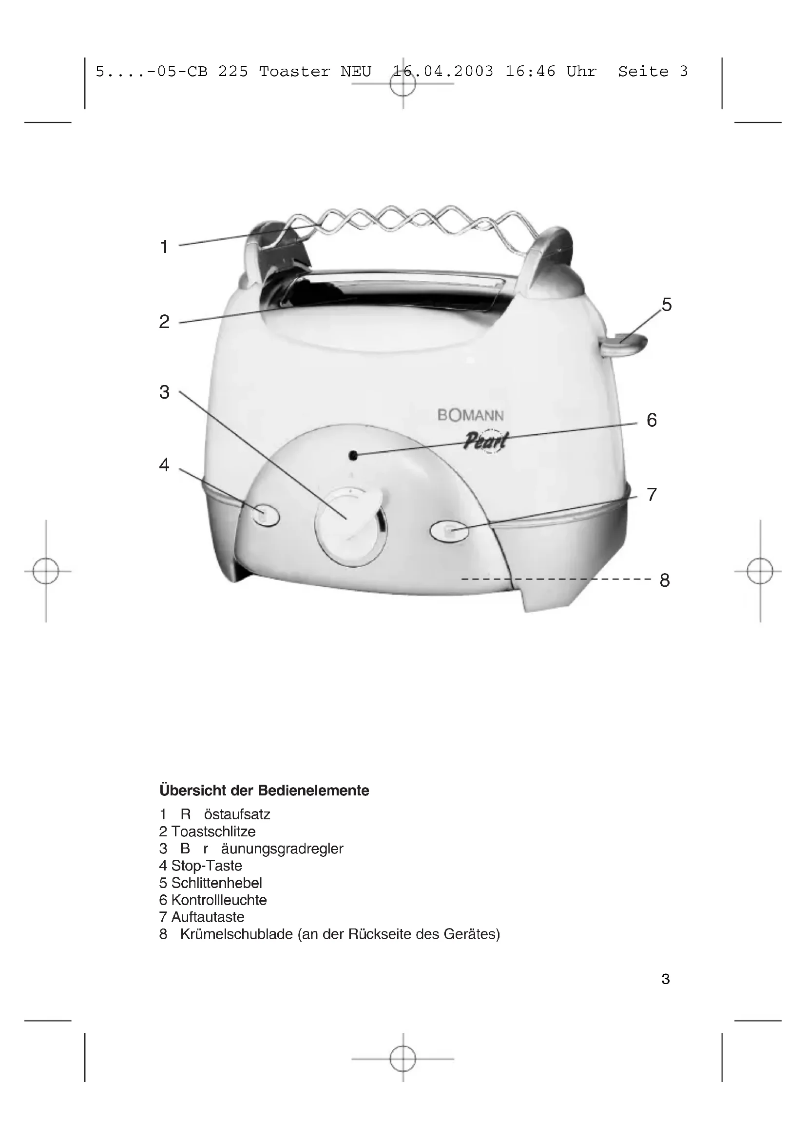 Kullanma maddelerine ait tablo . . . . . . . . . . . . . . . . . . . . . .Saysa 3 Kullanma kılavuzu . . . . . . . . . . . . . . . . . . . . . . . . . . . . . . . . .Saysa 38 Garanti . . . . . . . . . . . . . . . . . . . . . . . . . . . . . . . . . . . . . . . . . .Saysa 40 5....-05-CB 225 Toaster NEU 16.04.2003 16:46 Uhr Seite 23 Übersicht der Bedienelemente 1Röstaufsatz 2 Toastschlitze 3Bräunungsgradregler 4 Stop-Taste 5 Schlittenhebel 6 Kontrollleuchte 7 Auftautaste 8Krümelschublade (an der Rückseite des Gerätes)