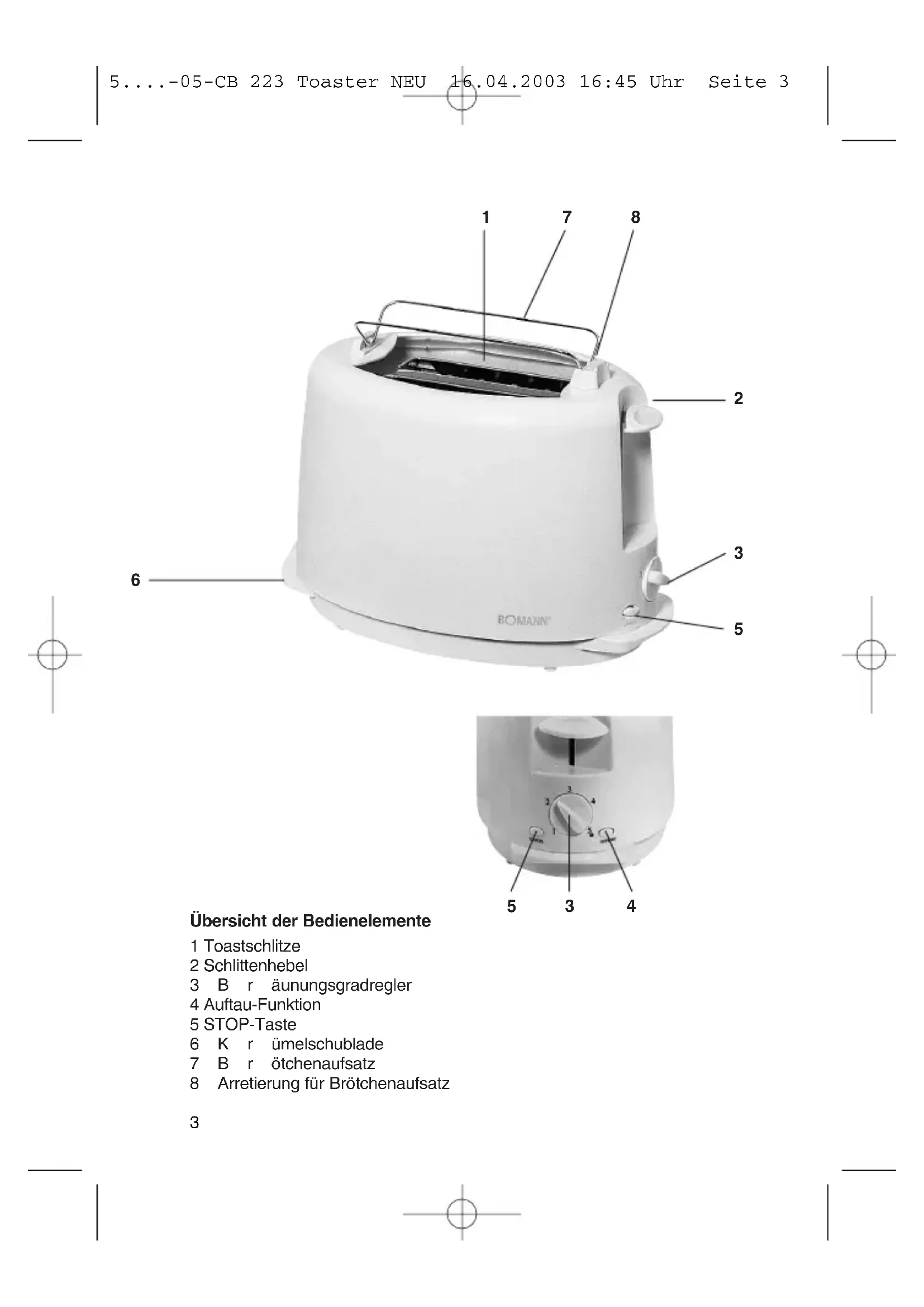 5....-05-CB 223 Toaster NEU 16.04.2003 16:45 Uhr Seite 23 Übersicht der Bedienelemente 1 Toastschlitze 2 Schlittenhebel 3Bräunungsgradregler 4 Auftau-Funktion 5 STOP-Taste 6Krümelschublade 7Brötchenaufsatz 8 Arretierung für Brötchenaufsatz