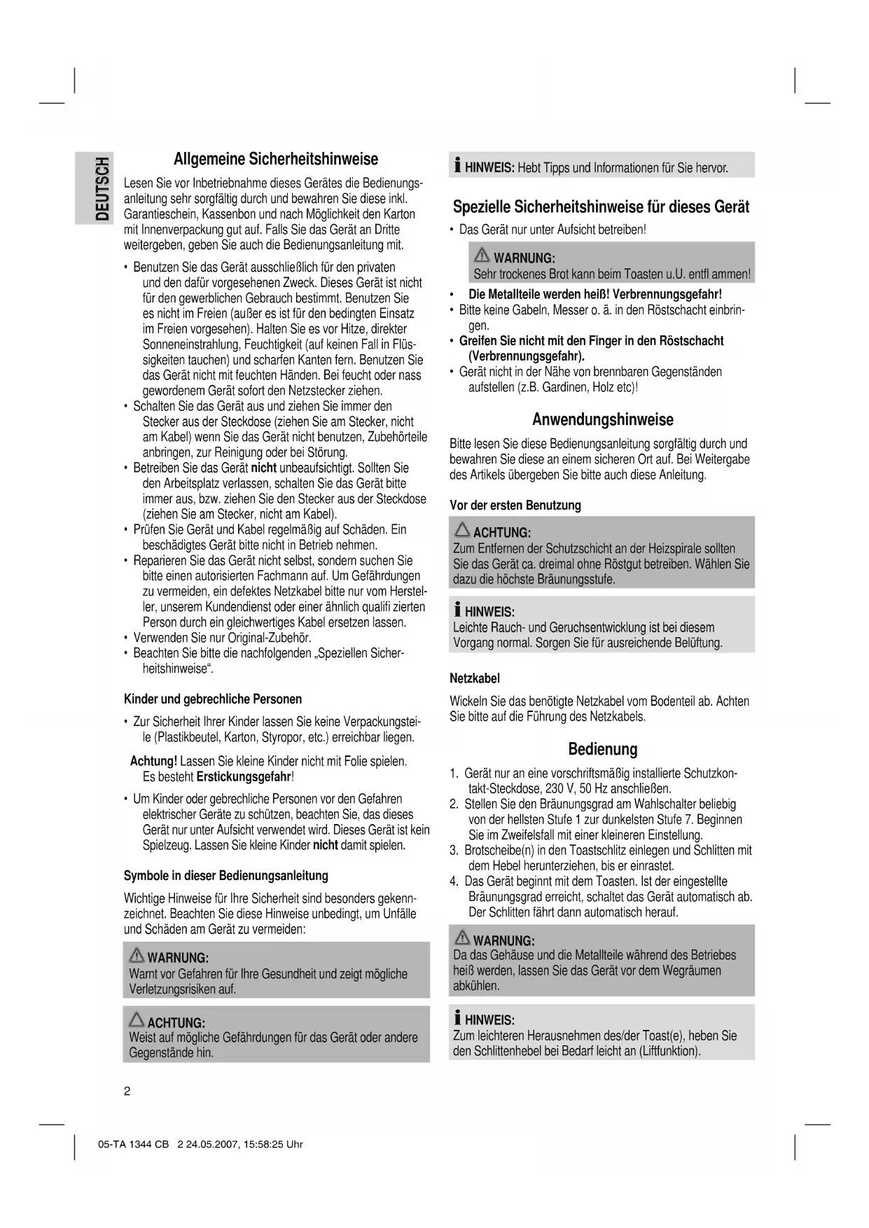 05-TA 1344 CB 1 24.05.2007, 16:07:44 Uhr2 DEUTSCH DEUTSCH Allgemeine Sicherheitshinweise Lesen Sie vor Inbetriebnahme dieses Gerätes die Bedienungs- anleitung sehr sorgfältig durch und bewahren Sie diese inkl. Garantieschein, Kassenbon und nach Möglichkeit den Karton mit Innenverpackung gut auf. Falls Sie das Gerät an Dritte weitergeben, geben Sie auch die Bedienungsanleitung mit.