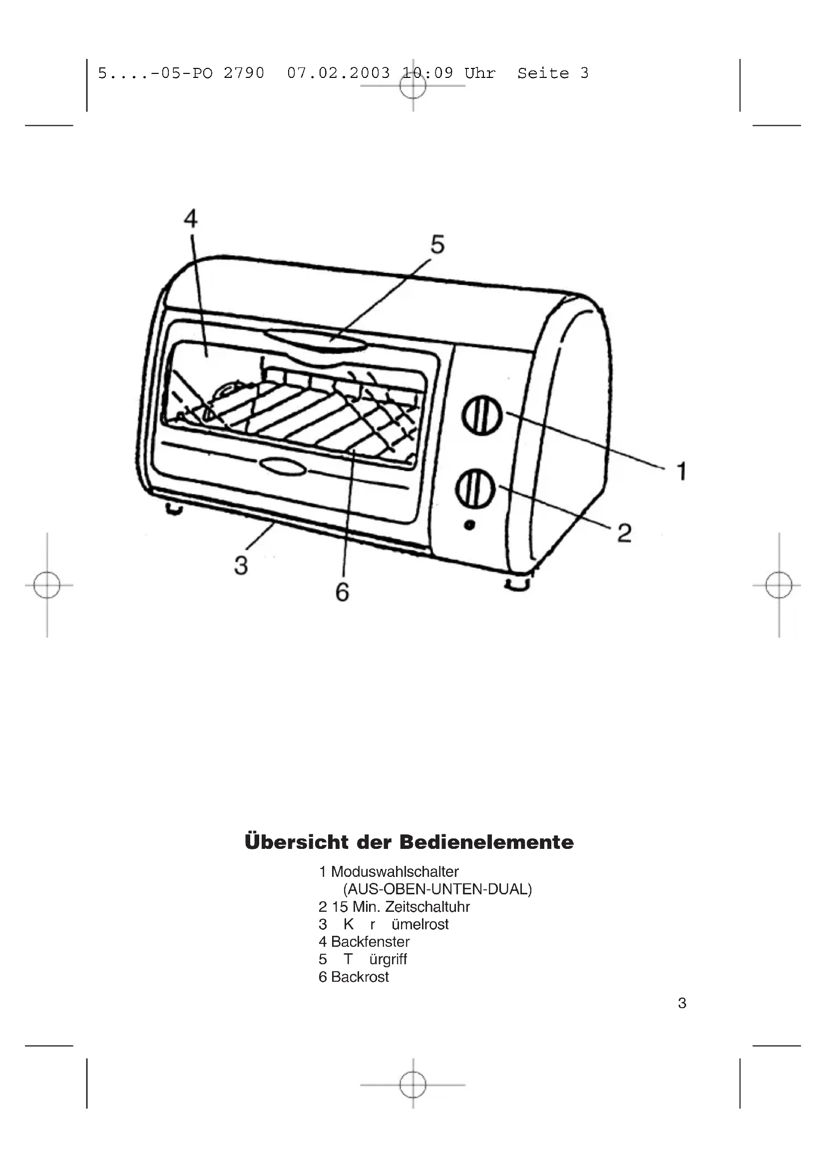 5....-05-CB 1261 Pizzaofen 05.03.2003 14:32 Uhr Seite 23 Übersicht der Bedienelemente 1 Moduswahlschalter (AUS-OBEN-UNTEN-DUAL) 2 15 Min. Zeitschaltuhr 3Krümelrost 4 Backfenster 5Türgriff 6 Backrost 5....-05-PO 2790 07.02.2003 10:09 Uhr Seite 3Allgemeine Sicherheitshinweise