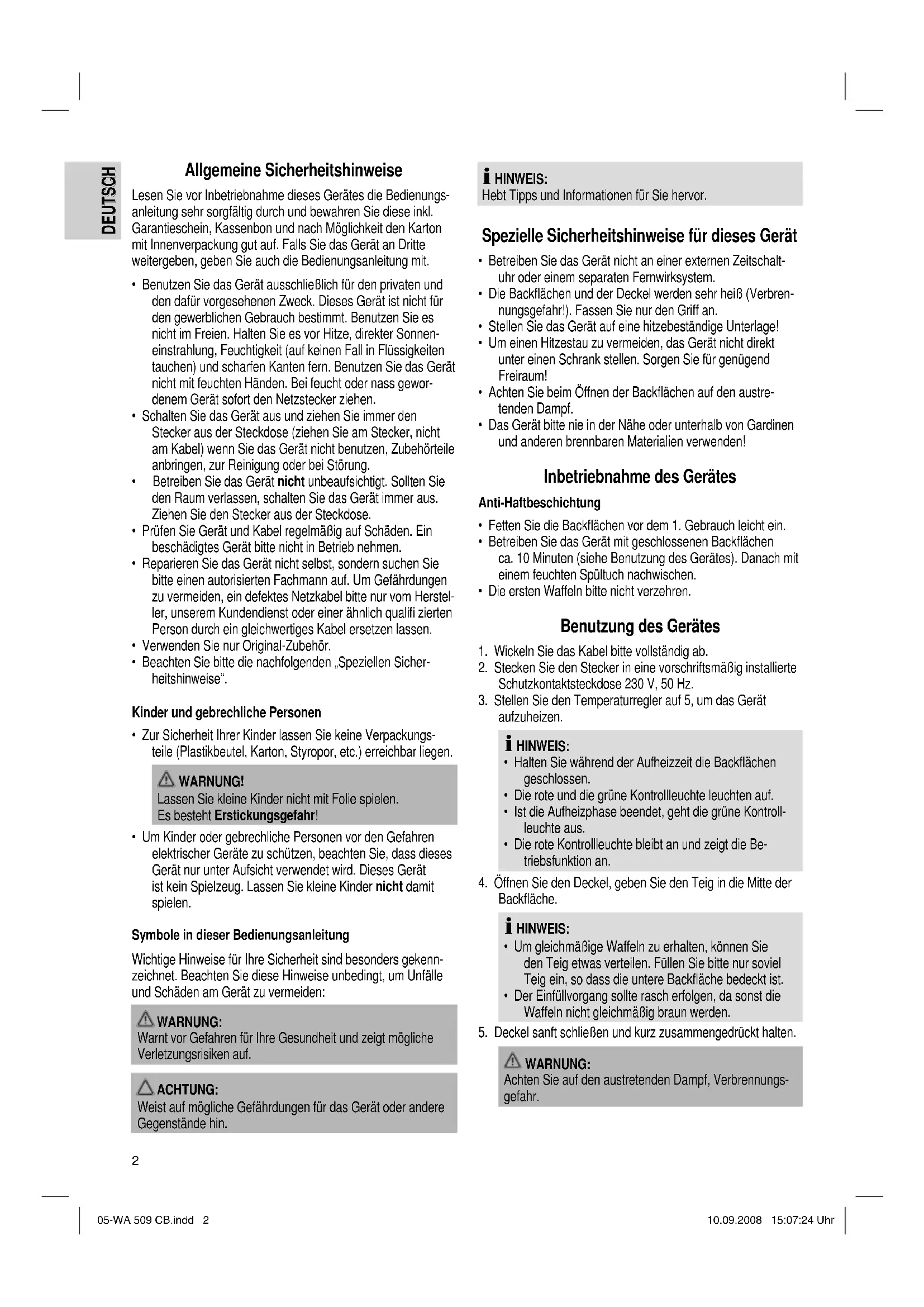 05-WA 509 CB.indd 105-WA 509 CB.indd 1 10.09.2008 15:07:17 Uhr10.09.2008 15:07:17 Uhr2 DEUTSCH DEUTSCH Allgemeine Sicherheitshinweise Lesen Sie vor Inbetriebnahme dieses Gerätes die Bedienungs- anleitung sehr sorgfältig durch und bewahren Sie diese inkl. Garantieschein, Kassenbon und nach Möglichkeit den Karton mit Innenverpackung gut auf. Falls Sie das Gerät an Dritte weitergeben, geben Sie auch die Bedienungsanleitung mit.