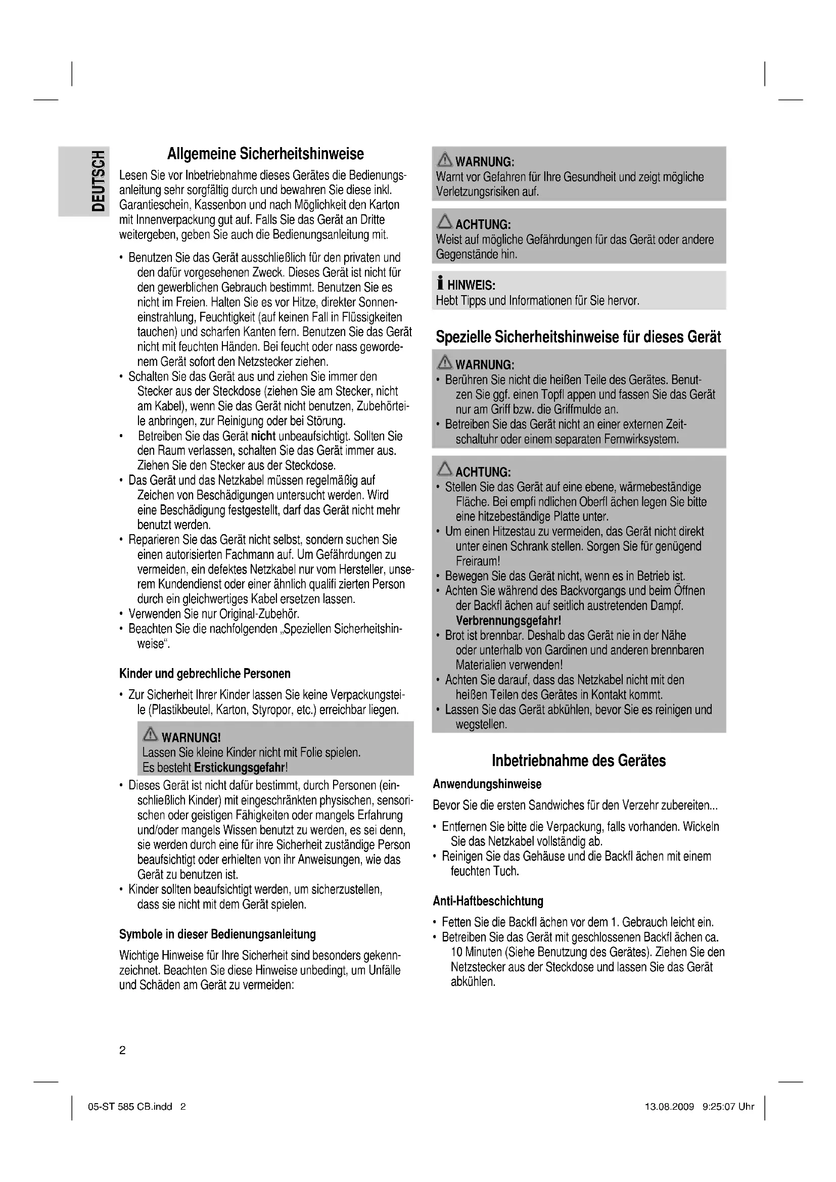 - Betreiben Sie das Gerät mit geschlossenen Backfl ächen ca. 10 Minuten (Siehe Benutzung des Gerätes). Ziehen Sie den Netzstecker aus der Steckdose und lassen Sie das Gerät abkühlen. 05-ST 585 CB.indd 205-ST 585 CB.indd 2 13.08.2009 9:25:07 Uhr13.08.2009 9:25:07 Uhr3 DEUTSCH DEUTSCH
