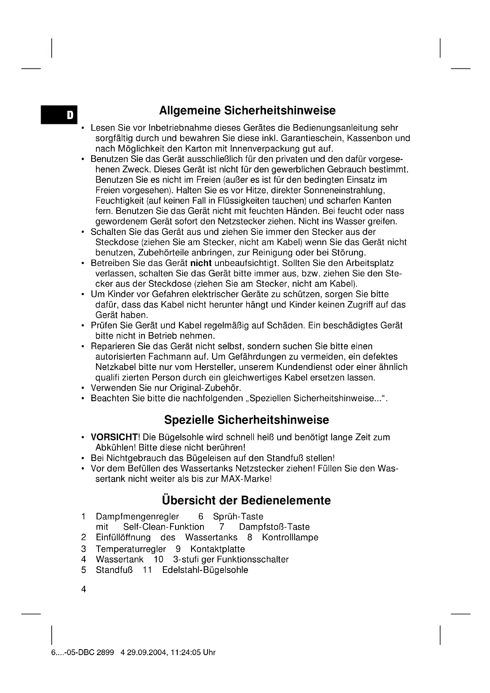 - Vor dem Befüllen des Wassertanks Netzstecker ziehen! Füllen Sie den Was- sertank nicht weiter als bis zur MAX-Marke! Übersicht der Bedienelemente 1 Dampfmengenregler 6 Sprüh-Taste mit Self-Clean-Funktion 7 Dampfstoß-Taste 2 Einfüllöffnung des Wassertanks 8 Kontrolllampe 3 Temperaturregler 9 Kontaktplatte 4 Wassertank 10 3-stufi ger Funktionsschalter 5 Standfuß 11 Edelstahl-Bügelsohle 6....-05-DBC 2899 4 29.09.2004, 11:24:05 UhrD