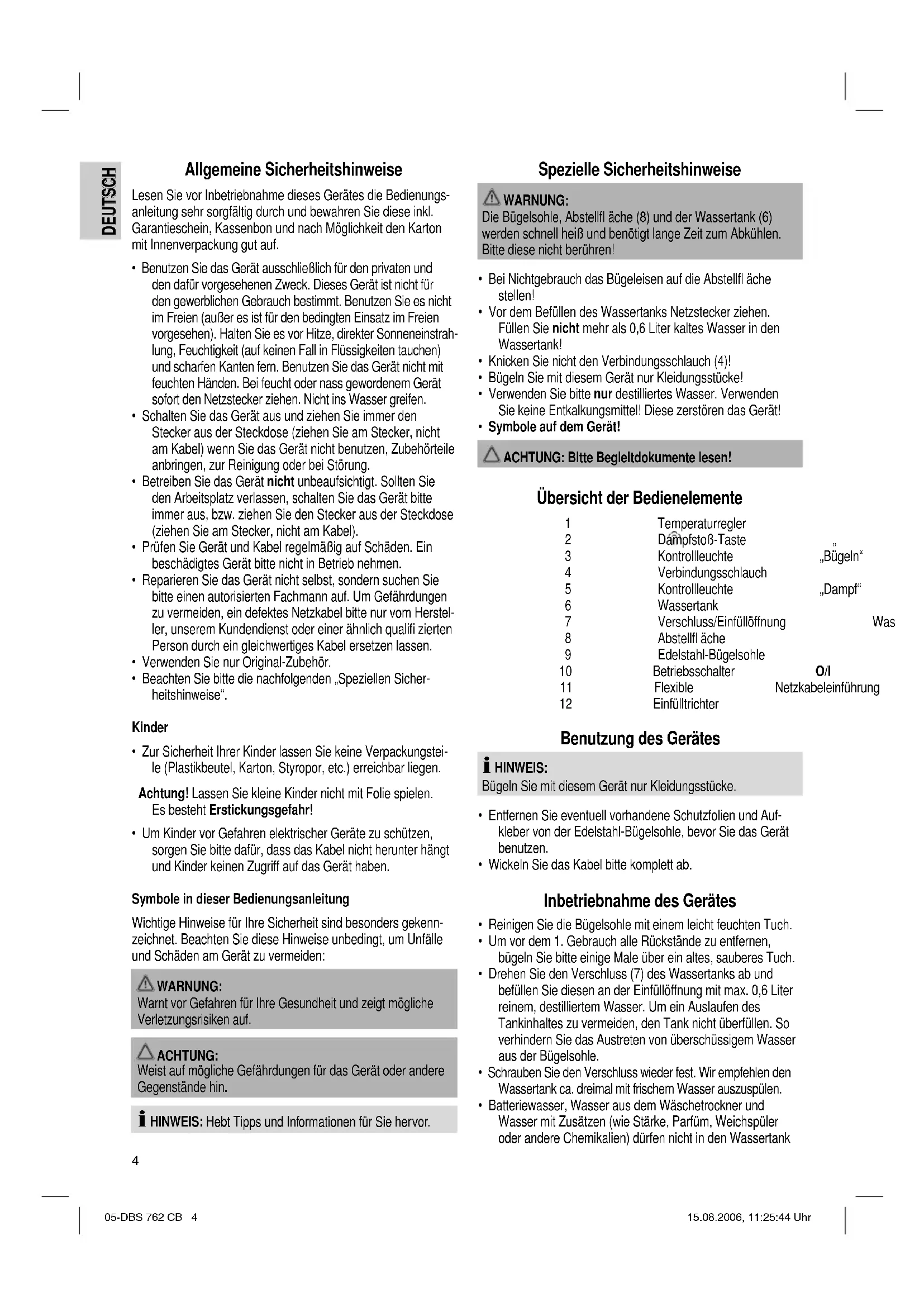 - Symbole auf dem Gerät! ACHTUNG: Bitte Begleitdokumente lesen! Übersicht der Bedienelemente 1 Temperaturregler 2 Dampfstoß-Taste „ “ 3 Kontrollleuchte „Bügeln“ 4 Verbindungsschlauch 5 Kontrollleuchte „Dampf“ 6 Wassertank 7 Verschluss/Einfüllöffnung Wassertank 8 Abstellfl äche 9 Edelstahl-Bügelsohle 10 Betriebsschalter O/I 11 Flexible Netzkabeleinführung 12 Einfülltrichter Benutzung des Gerätes HINWEIS: Bügeln Sie mit diesem Gerät nur Kleidungsstücke.