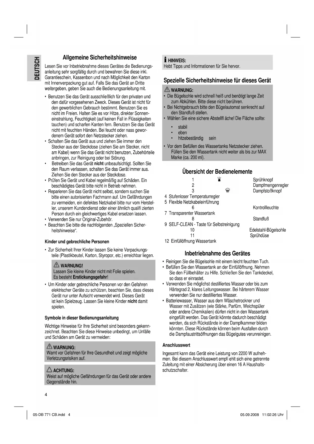 Обзор деталей прибора .............................................. стр. 3 Руководство по эксплуатации .................................... стр. 36 Технические данные ................................................... стр. 38 05-DB 771 CB.indd 205-DB 771 CB.indd 2 05.09.2008 11:02:25 Uhr05.09.2008 11:02:25 Uhr3 Übersicht der Bedienelemente Overzicht van de bedieningselementen • Liste des différents éléments de commande Indicación de los elementos de manejo • Descrição dos elementos • Elementi di comando Oversikt over betjeningselementene • Overview of the Components Przegląd elementów obsługi • Přehled ovládacích prvků • A kezelőelemek áttekintése Обзор деталей прибора 05-DB 771 CB.indd 305-DB 771 CB.indd 3 05.09.2008 11:02:26 Uhr05.09.2008 11:02:26 Uhr4 DEUTSCH DEUTSCH Allgemeine Sicherheitshinweise Lesen Sie vor Inbetriebnahme dieses Gerätes die Bedienungs- anleitung sehr sorgfältig durch und bewahren Sie diese inkl. Garantieschein, Kassenbon und nach Möglichkeit den Karton mit Innenverpackung gut auf. Falls Sie das Gerät an Dritte weitergeben, geben Sie auch die Bedienungsanleitung mit.