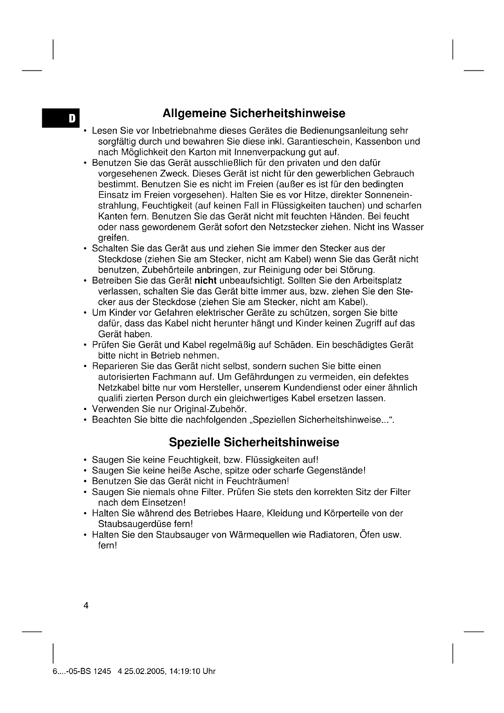 - Halten Sie den Staubsauger von Wärmequellen wie Radiatoren, Öfen usw. fern! 6....-05-BS 1245 4 25.02.2005, 14:19:10 UhrD