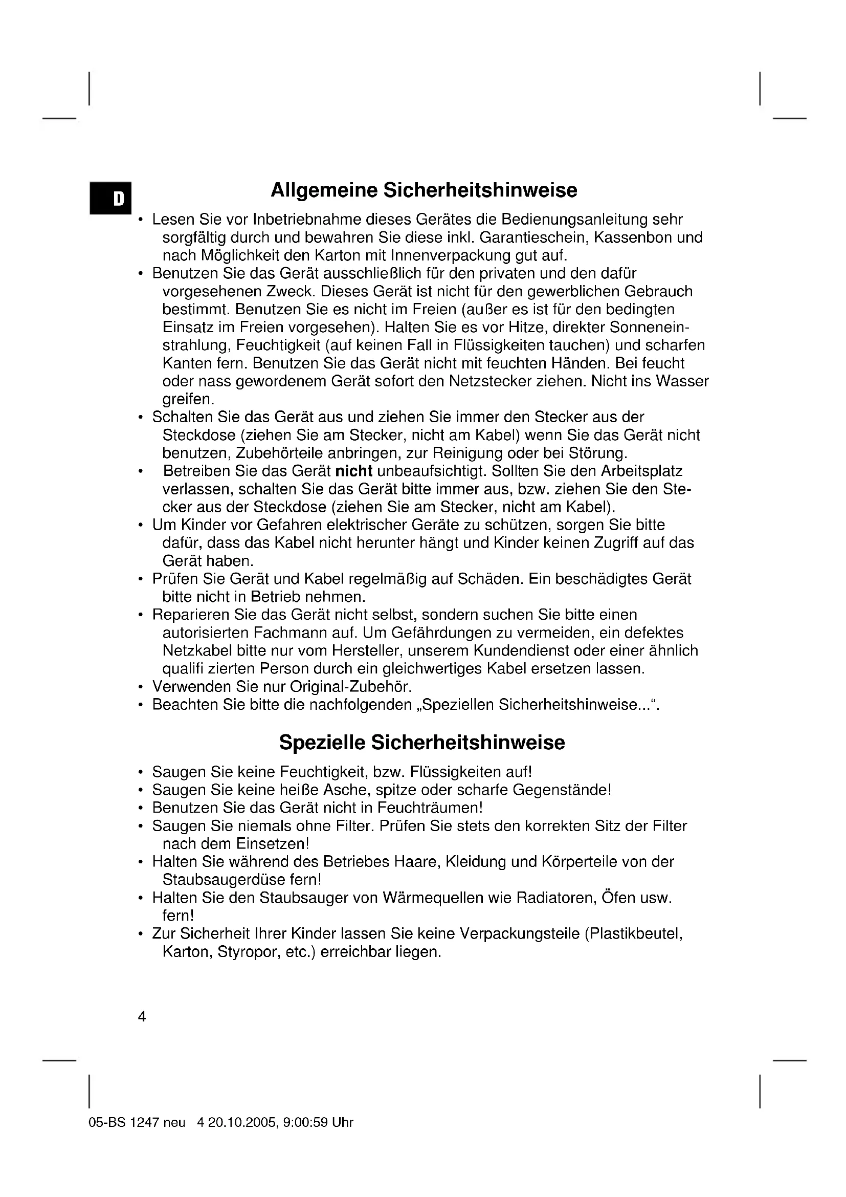 - Zur Sicherheit Ihrer Kinder lassen Sie keine Verpackungsteile (Plastikbeutel, Karton, Styropor, etc.) erreichbar liegen. 05-BS 1247 neu 4 20.10.2005, 9:00:59 UhrD