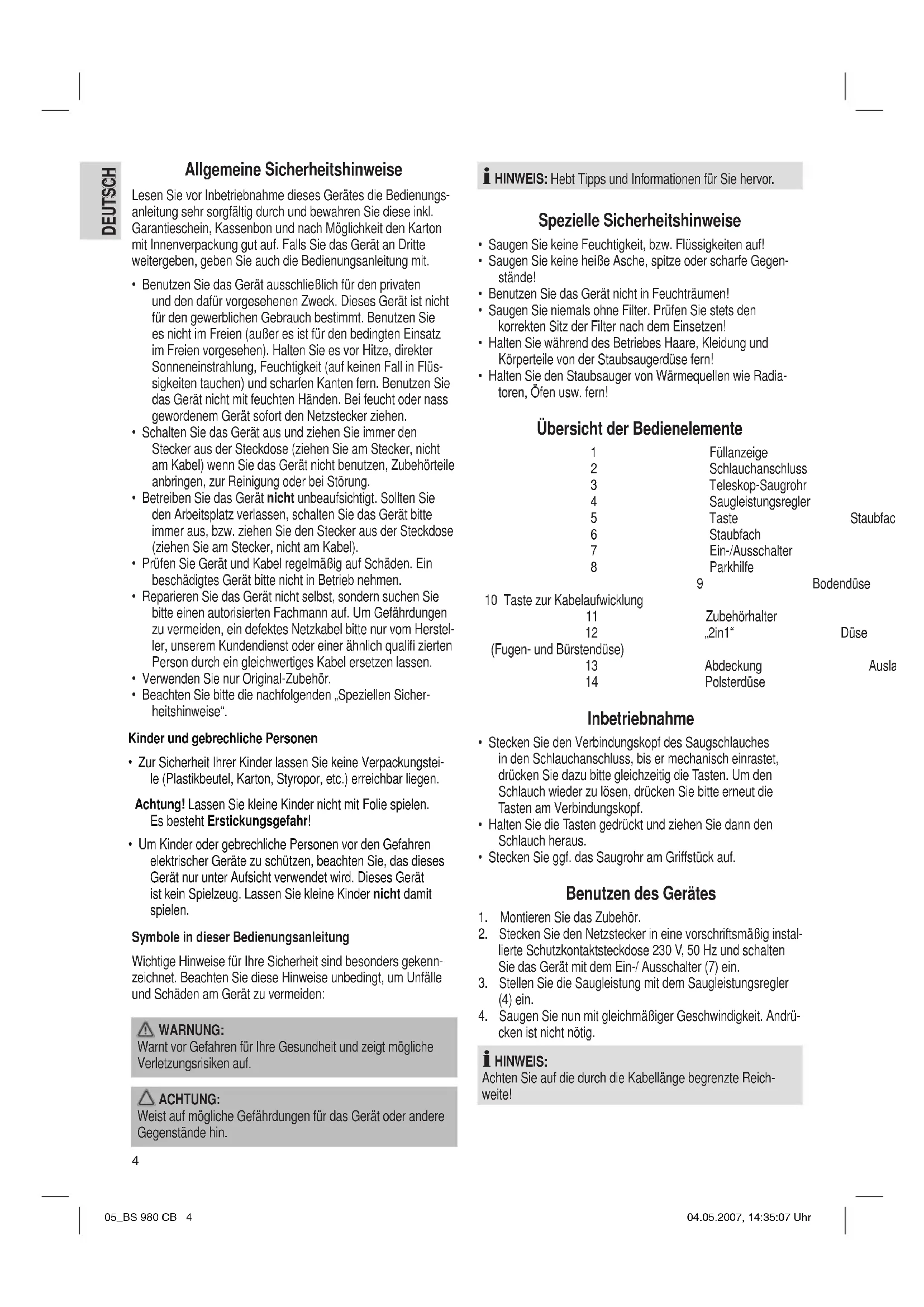 Обзор деталей прибора.............................................. стр. 3 Руководство по эксплуатации.................................... стр. 49 Технические данные................................................... стр. 52 Гарантия....................................................................... стр. 52 05_BS 980 CB 2 04.05.2007, 14:35:05 Uhr3 Übersicht der Bedienelemente Overzicht van de bedieningselementen • Liste des différents éléments de commande Indicación de los elementos de manejo • Descrição dos elementos • Elementi di comando Oversikt over betjeningselementene • Overview of the Components Przegląd elementów obsługi • Přehled ovládacích prvků • A kezelő elemek áttekintése Обзор деталей прибора 05_BS 980 CB 3 04.05.2007, 14:35:07 Uhr4 DEUTSCH DEUTSCH Allgemeine Sicherheitshinweise Lesen Sie vor Inbetriebnahme dieses Gerätes die Bedienungs- anleitung sehr sorgfältig durch und bewahren Sie diese inkl. Garantieschein, Kassenbon und nach Möglichkeit den Karton mit Innenverpackung gut auf. Falls Sie das Gerät an Dritte weitergeben, geben Sie auch die Bedienungsanleitung mit.