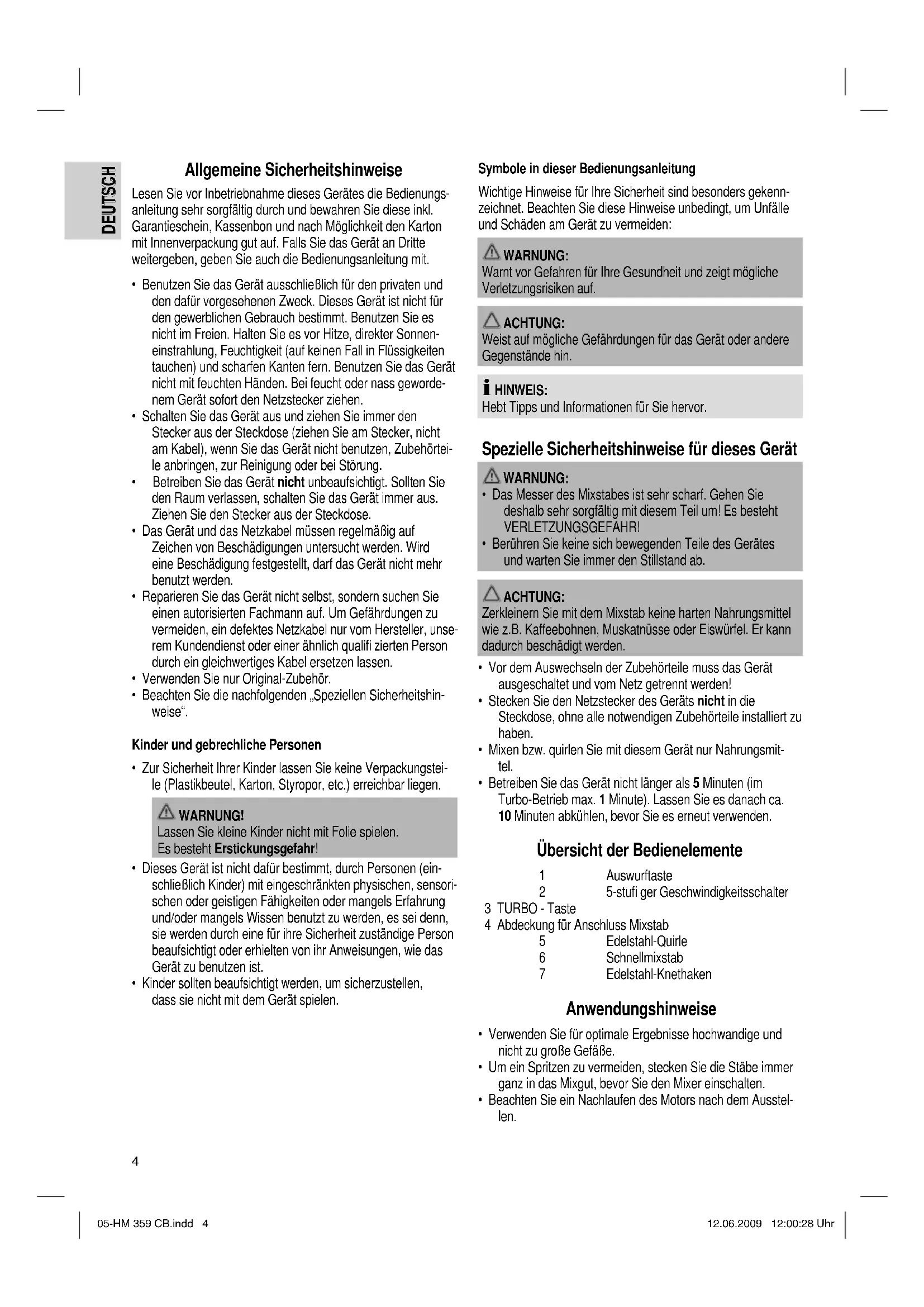 - Beachten Sie ein Nachlaufen des Motors nach dem Ausstel- len. 05-HM 359 CB.indd 405-HM 359 CB.indd 4 12.06.2009 12:00:28 Uhr12.06.2009 12:00:28 Uhr5 DEUTSCH DEUTSCH