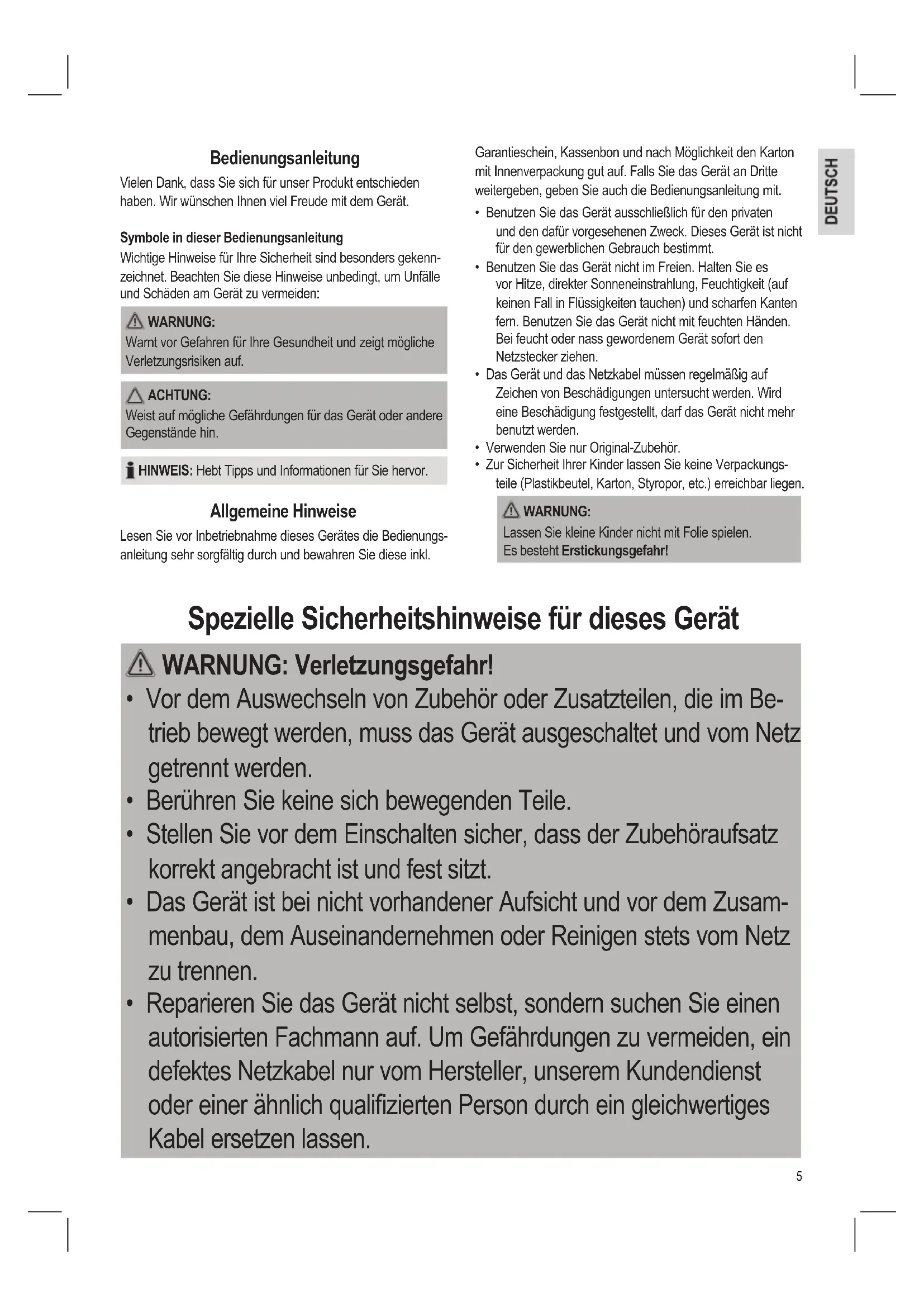 - Zur Sicherheit Ihrer Kinder lassen Sie keine Verpackungs- teile (Plastikbeutel, Karton, Styropor, etc.) erreichbar liegen. WARNUNG: Lassen Sie kleine Kinder nicht mit Folie spielen. Es besteht Erstickungsgefahr! Spezielle Sicherheitshinweise für dieses Gerät WARNUNG: Verletzungsgefahr!