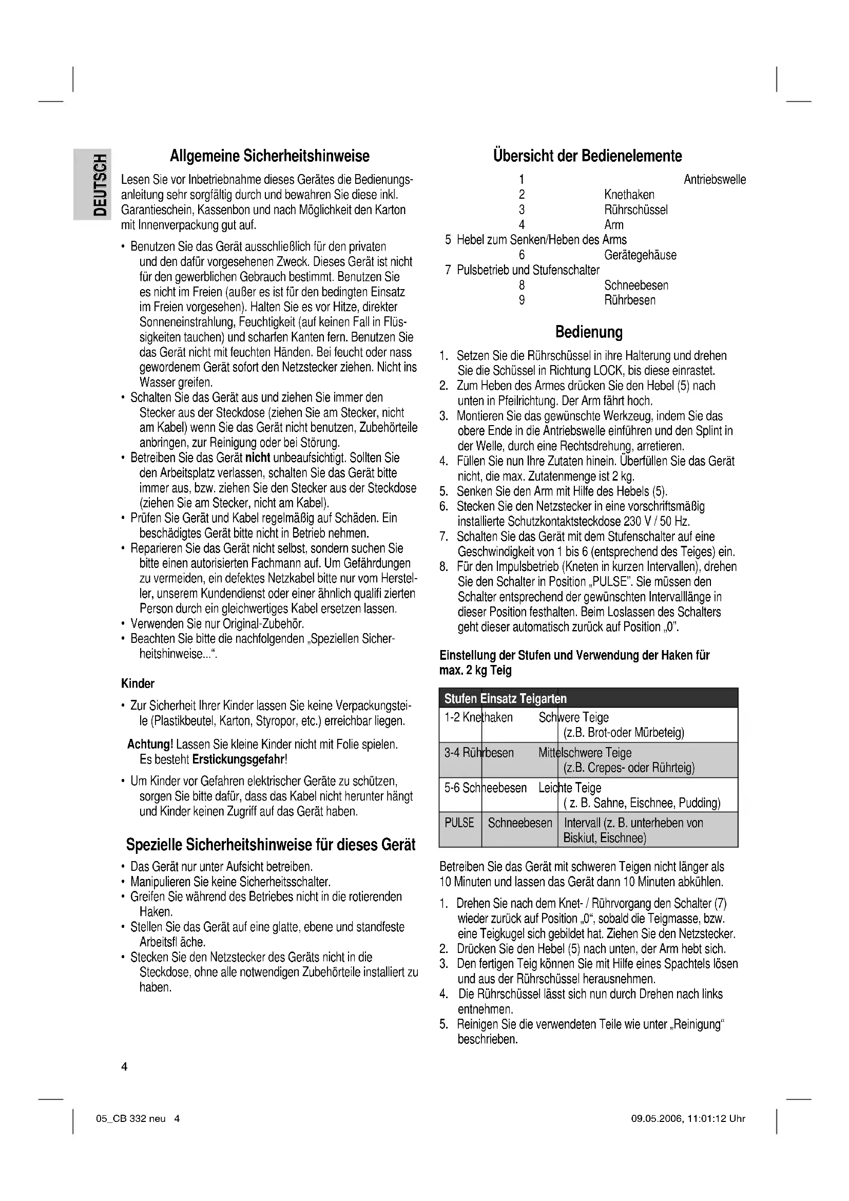sind (Knetwerkzeug und Rührschüssel), können Sie in einem Spülbad reinigen. Rezeptvorschläge Rührteig (Grundrezept) Stufe 3-4 Zutaten: 250g weiche Butter oder Margarine, 250g Zucker, 1 Pck. Vanillezucker oder 1 Btl. Citro-Back, 1 Pr. Salz, 4 Eier, 500g Weizenmehl, 1 Pck. Backpulver, ca. 1/8 l Milch. Zubereitung: Weizenmehl mit den restlichen Zutaten in die Rührschüssel geben, mit dem Rührbesen 30 Sekunden Stufe 1, dann ca. 3 Minuten auf Stufe 3 rühren. Form fetten oder mit Backpapier auslegen, Teig einfüllen und Backen. Bevor das Gebäck aus dem Ofen genommen wird, eine Garprobe machen: Mit einem spitzen Holz stäbchen in die Mitte des Gebäcks stechen. Wenn kein Teig daran hängen bleibt, ist der Kuchen gar. Kuchen auf einen Kuchenrost stürzen und auskühlen lassen. Herkömmlicher Herd: Einschubhöhe: 2 Beheizung: E-Herd Ober- und Unterhitze 175-200°, G-Herd: Stufe 2-3 Backzeit: 50-60 Minuten Dieses Rezept können Sie je nach Geschmack, z. B. mit 100g Rosinen oder 100g Nüsse oder 100g geriebenen Schokolade verändern. Weiterhin sind Ihrer Phantasie keine Grenzen gesetzt. Leinsamenbrötchen Stufe 1-2 Zutaten: 500-550g Weizenmehl, 50g Leinsamen, 3/8 l Wasser, 1 Würfel Hefe (40g), 100g Magerquark, gut abgetropft, 1 TL Salz. Zum Bestreichen: 2 EL Wasser Zubereitung: Leinsamen in 1/8 l lauwarmem Wasser einweichen. Das restliche lauwarme Wasser (1/4 l) in die Rührschüssel geben, Hefe hineinbröckeln, Quark zugeben und mit dem Knethaken auf Stufe 2 gut verrühren. Die Hefe muss vollständig aufgelöst sein. Mehl mit den eingeweichten Leinsamen und Salz in die Rührschüssel geben. Auf Stufe 1 durchkneten, dann auf Stufe 2 schalten und 3-5 Minuten weiterkneten. Teig ab decken, 45-60 Minuten an einem warmen Ort gehen lassen. Noch einmal durchkneten, aus der Schüssel nehmen und daraus 16 Brötchen formen. Backblech mit nassem Backpapier auslegen. Brötchen darauf setzen, 15 Minuten gehen lassen, mit lauwarmen Wasser bestreichen und backen. Herkömmlicher Herd: Einschubhöhe: 2 Beheizung: E-Herd: Ober- und Unterhitze 200-220° (5 Minuten vorheizen), G-Herd Stufe 2-3 Backzeit: 30-40 Minuten Schokoladencreme Stufe 5-6 Zutaten: 200ml süße Sahne, 150g Halbbitter-Kuvertüre, 3 Eier, 50-60g Zucker, 1 Pr. Salz, 1 Pck. Vanillezucker, 1 EL Cognac oder Rum, Schoko-Blätter. Zubereitung: Sahne in der Rührschüssel mit dem Schneebesen steif schla- gen. Aus der Schüssel nehmen und kühl stellen. Kuvertüre nach Packungsanleitung schmelzen, oder in der Mikrowelle bei 600 W, 3 Minuten. In der Zwischenzeit Eier, Zucker, Vanillezucker, Cognac oder Rum und Salz in der Rühr- schüssel mit dem Schneebesen auf Stufe 3 schaumig schlagen. Aufgelöste Kuvertüre zugeben und auf Stufe 5-6 gleichmäßig einrühren. Von der geschlagenen Sahne etwas zum Garnieren zurücklassen. Restliche Sahne auf die cremige Masse geben und mit der Pulsefunktion kurz einrühren. Schokoladencreme garnieren und gut gekühlt servieren. Geräuschentwicklung Gemessen wurde der Schalldruckpegel am Ohr einer Bedien- person (LpA) in Übereinstimmung mit der DIN EN ISO 3744. Ermittelter Schalldruckpegel: 86,2 dB(A) (kein Limit) Technische Daten Modell: ..............................................................................CB 332 Spannungsversorgung:.............................................230 V, 50 Hz Leistungsaufnahme:
