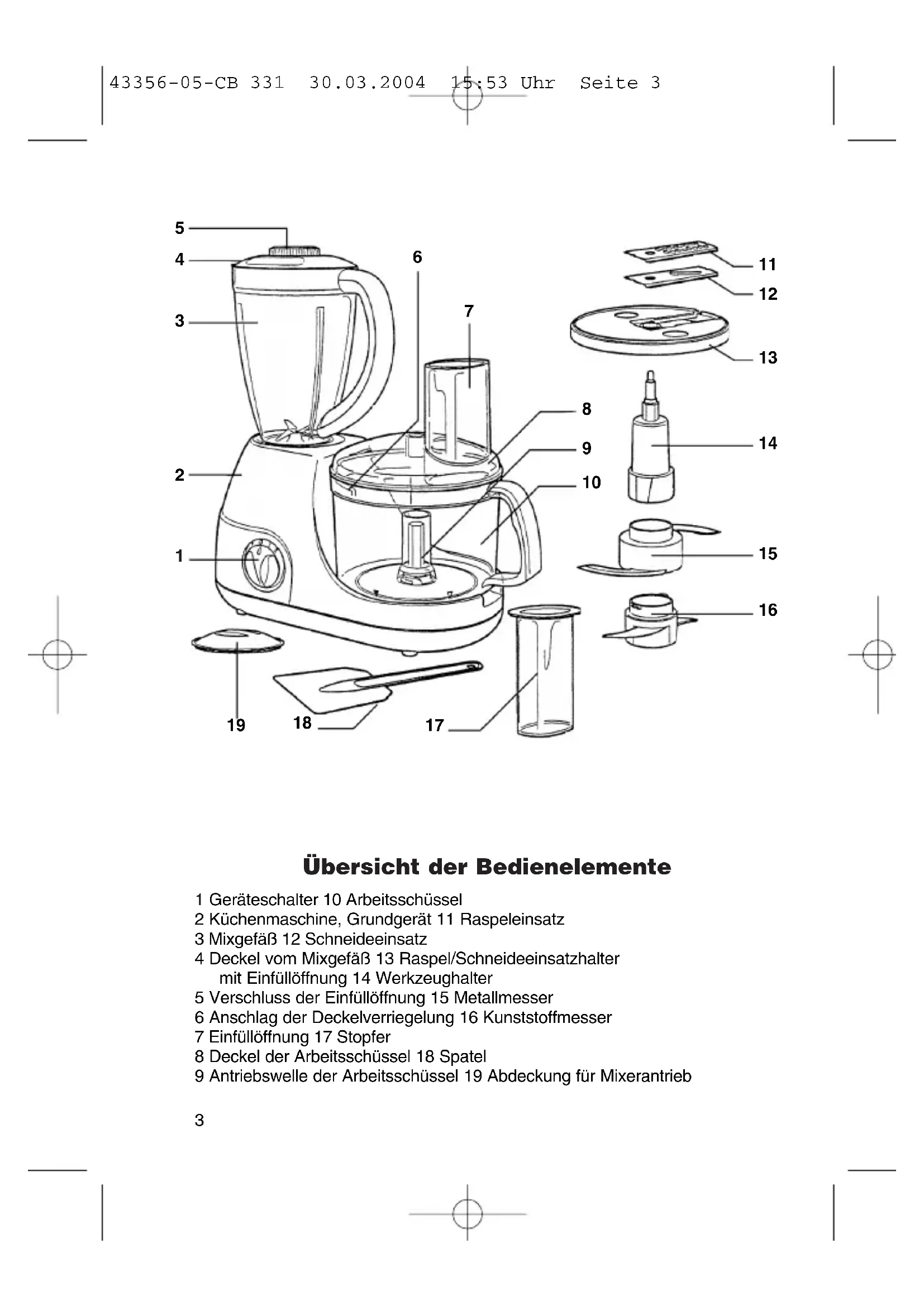 Kullanma maddelerine ait tablo . . . . . . . . . . . . . . . . . . . . . . .Saysa 3 Kullanma kılavuzu . . . . . . . . . . . . . . . . . . . . . . . . . . . . . . . . . .Saysa 54 Garanti . . . . . . . . . . . . . . . . . . . . . . . . . . . . . . . . . . . . . . . . . . . .Saysa 58 43356-05-CB 331 30.03.2004 15:53 Uhr Seite 2Übersicht der Bedienelemente 1 Geräteschalter 10 Arbeitsschüssel 2 Küchenmaschine, Grundgerät 11 Raspeleinsatz 3 Mixgefäß 12 Schneideeinsatz 4 Deckel vom Mixgefäß 13 Raspel/Schneideeinsatzhalter mit Einfüllöffnung 14 Werkzeughalter 5 Verschluss der Einfüllöffnung 15 Metallmesser 6 Anschlag der Deckelverriegelung 16 Kunststoffmesser 7 Einfüllöffnung 17 Stopfer 8 Deckel der Arbeitsschüssel 18 Spatel 9 Antriebswelle der Arbeitsschüssel 19 Abdeckung für Mixerantrieb
