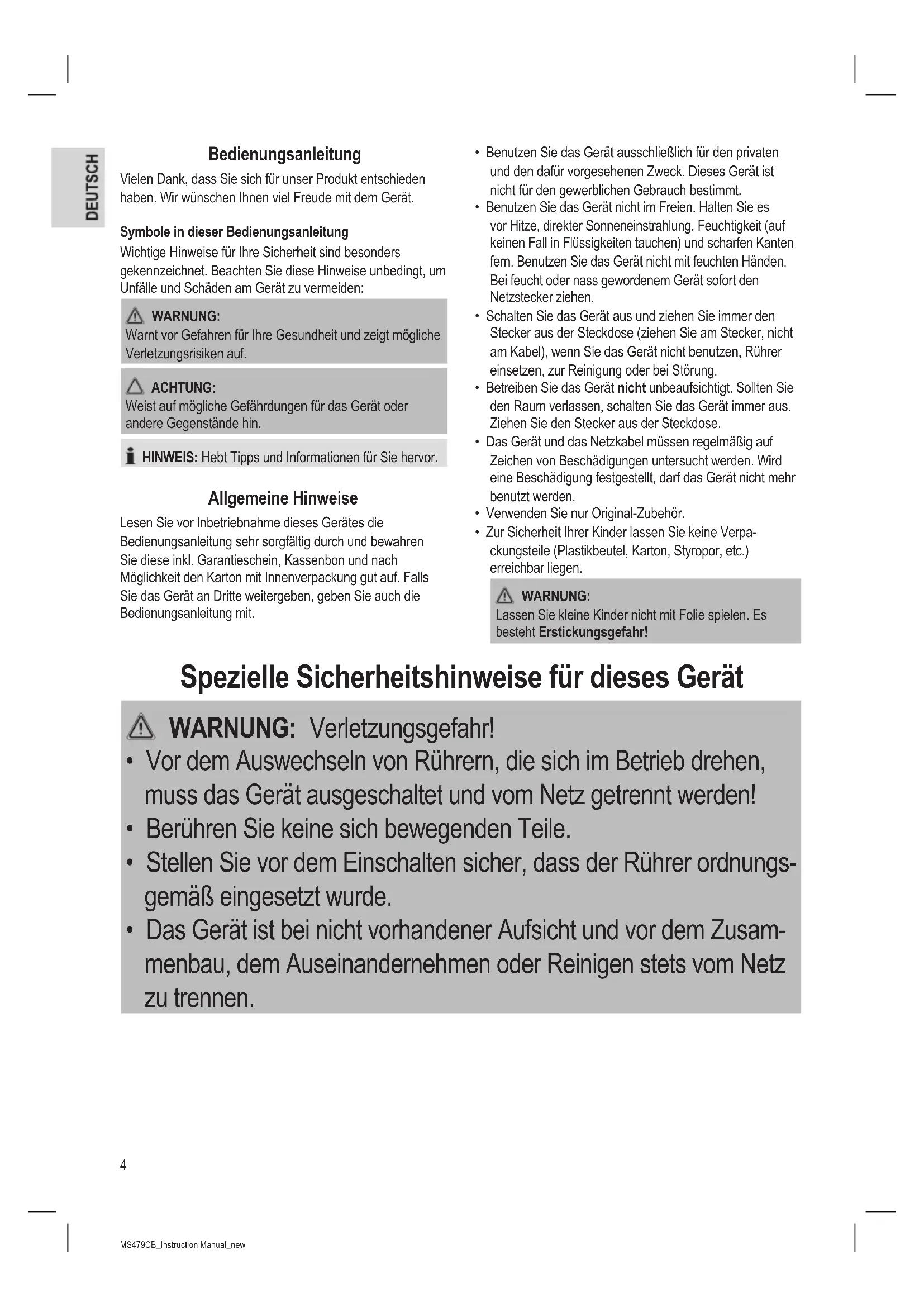 - Das Gerät ist bei nicht vorhandener Aufsicht und vor dem Zusam- menbau, dem Auseinandernehmen oder Reinigen stets vom Netz zu trennen.5 MS479CB_Instruction Manual_new 01.07.16 WARNUNG: Verletzungsgefahr!
