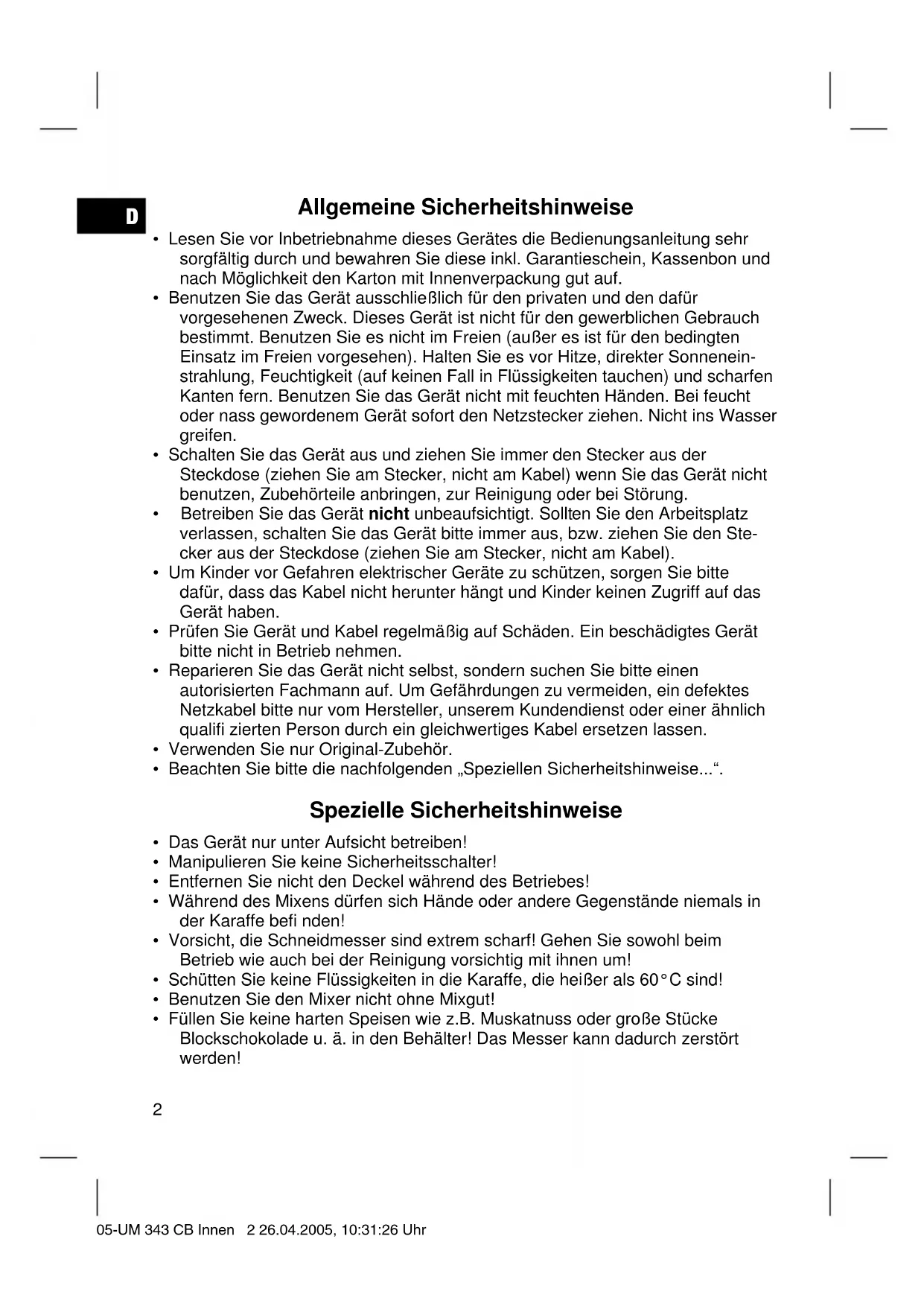 - Füllen Sie keine harten Speisen wie z.B. Muskatnuss oder große Stücke Blockschokolade u. ä. in den Behälter! Das Messer kann dadurch zerstört werden! 05-UM 343 CB Innen 2 26.04.2005, 10:31:26 UhrD
