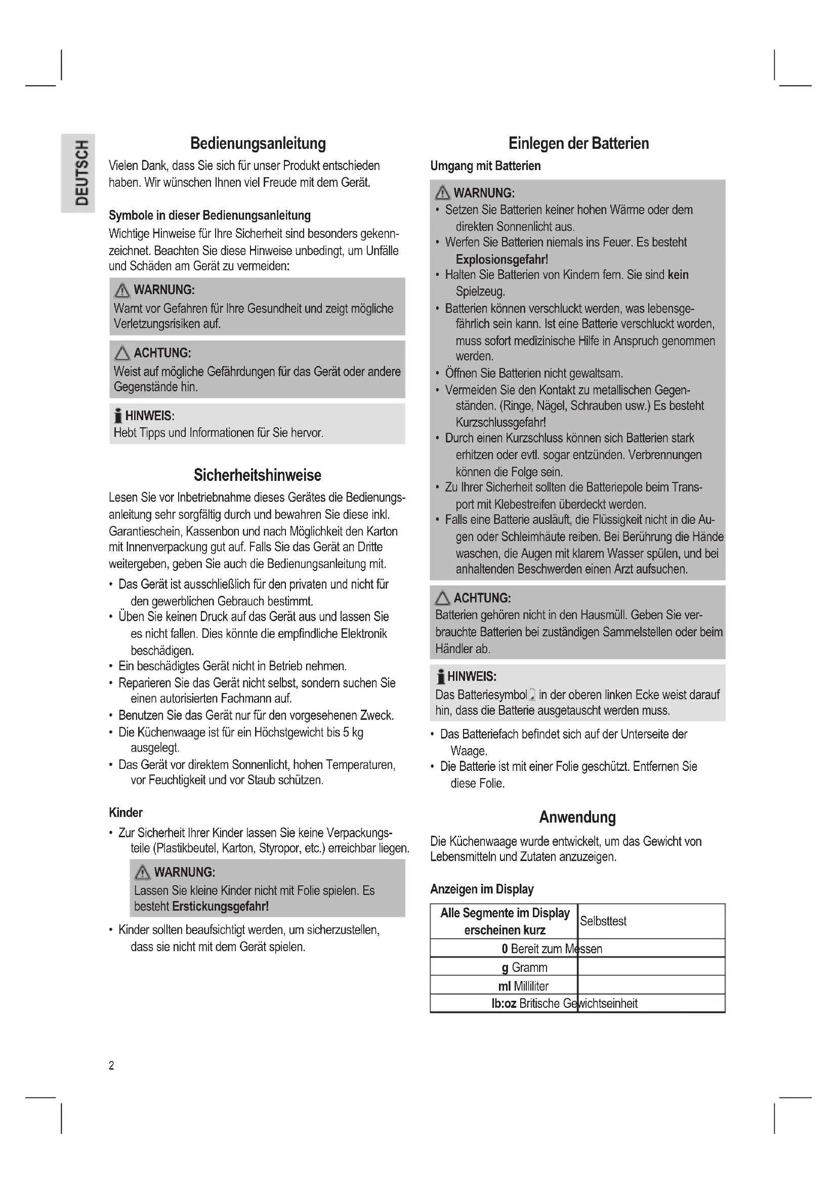 - Die Batterie ist mit einer Folie geschützt. Entfernen Sie diese Folie. Anwendung Die Küchenwaage wurde entwickelt, um das Gewicht von Lebensmitteln und Zutaten anzuzeigen. Anzeigen im Display Alle Segmente im Display erscheinen kurz Selbsttest 0 Bereit zum Messen g Gramm ml Milliliter lb:oz Britische Gewichtseinheit3 :oz Britisches Flüssigkeitsmaß Batteriemangel 0-Ld Überladung Zeigt die ausgewählte Maßeinheit an Einschalten