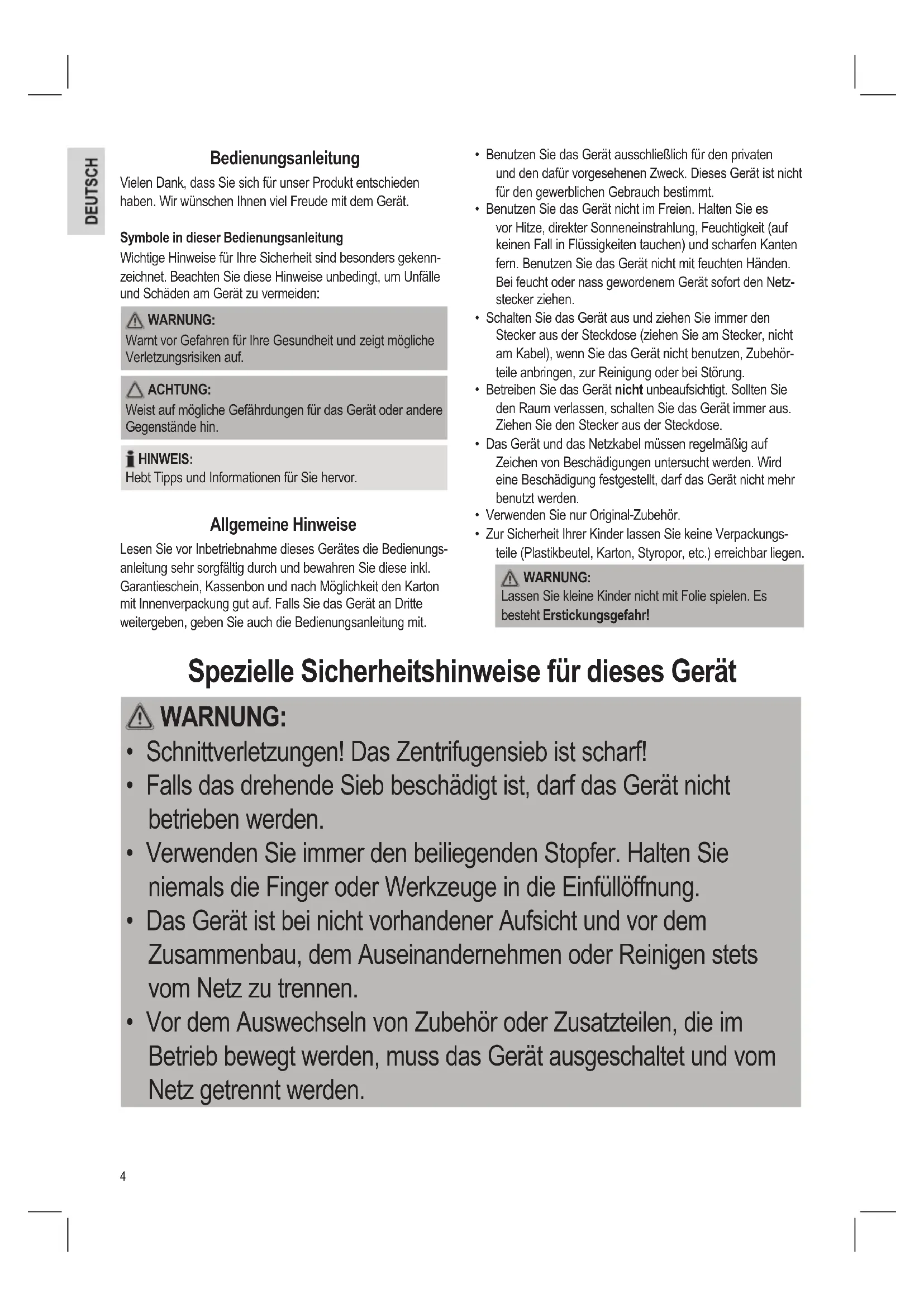 - Das Zentrifugensieb ist scharf! Verletzungsgefahr! ACHTUNG: