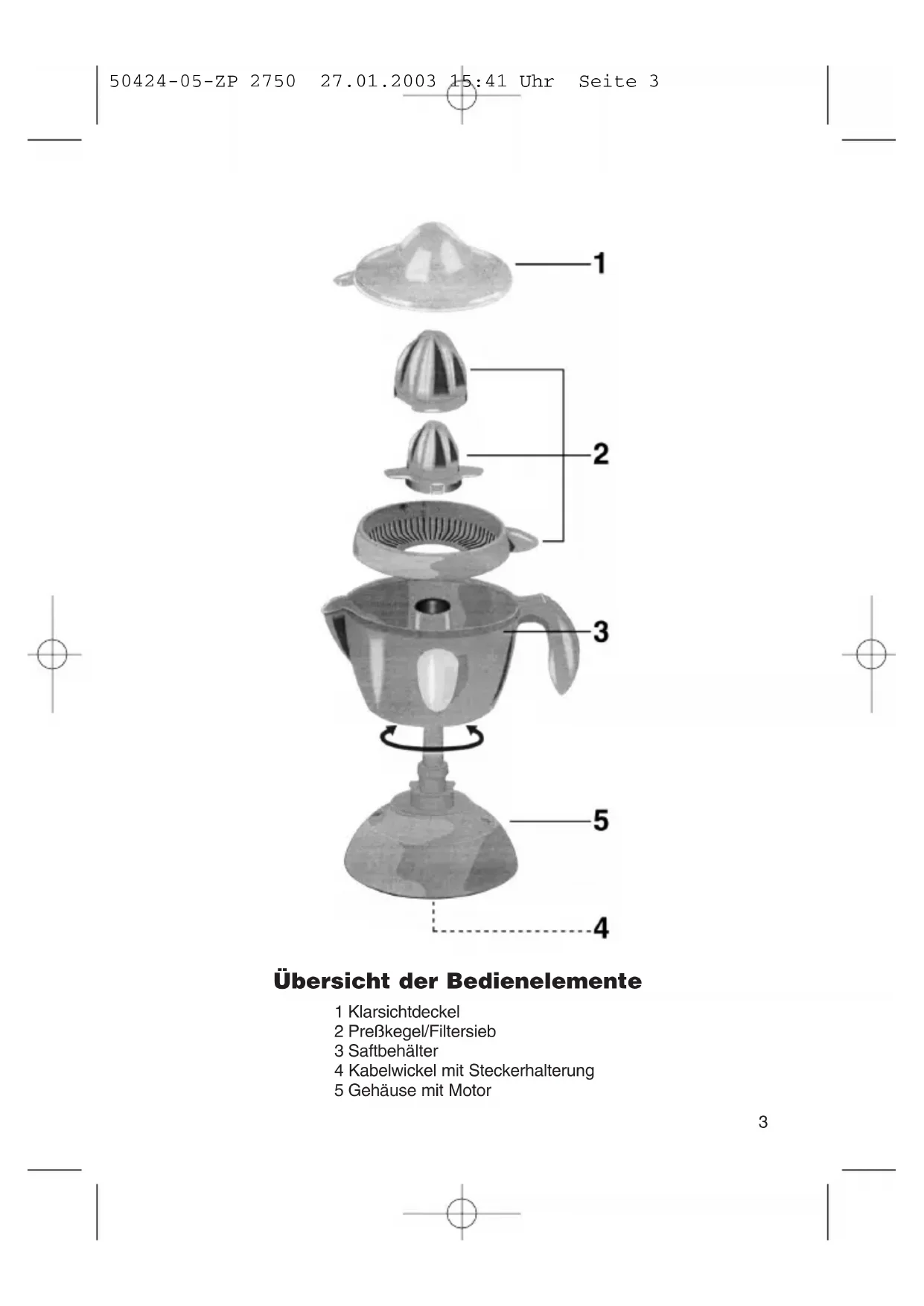 5....-05-CB 1083 Zitruspresse 27.01.2003 15:33 Uhr Seite 23 Übersicht der Bedienelemente 1 Klarsichtdeckel 2 Preßkegel/Filtersieb 3 Saftbehälter 4 Kabelwickel mit Steckerhalterung 5 Gehäuse mit Motor 50424-05-ZP 2750 27.01.2003 15:41 Uhr Seite 3Allgemeine Sicherheitshinweise