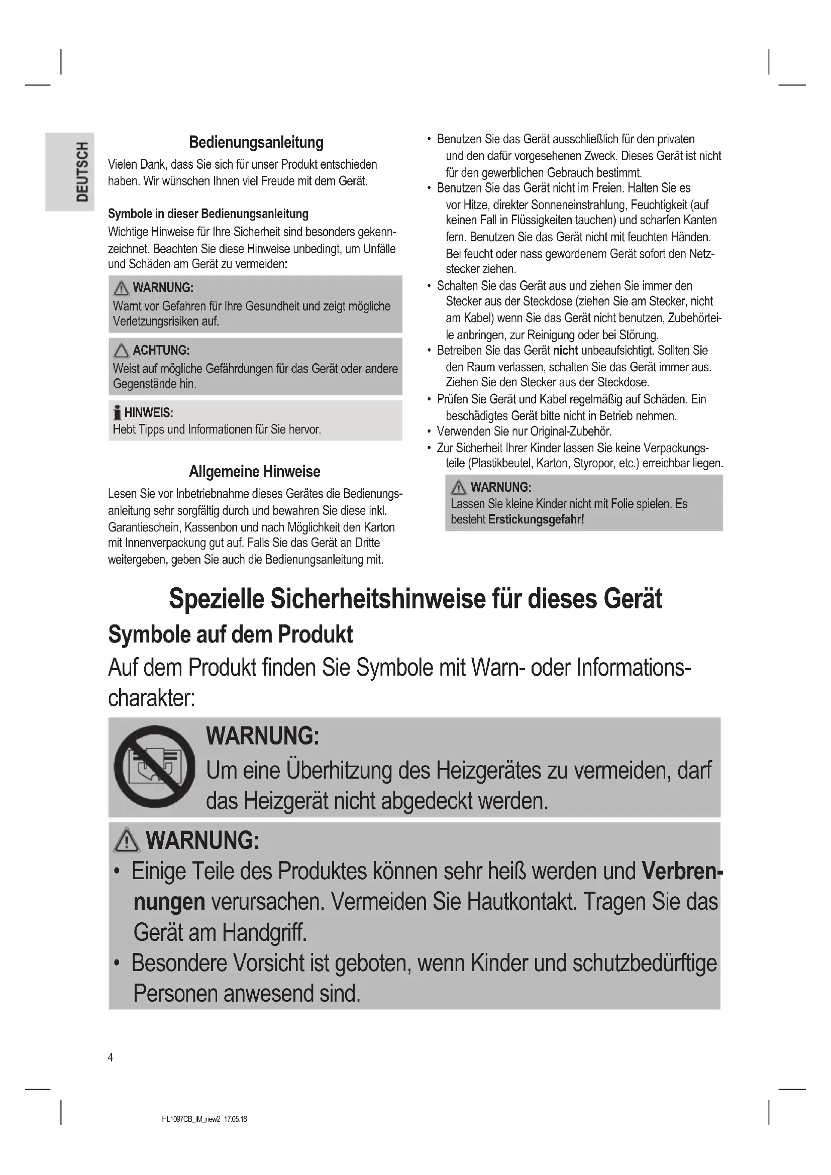 HL1097CB_IM_new2 17.05.184 HL1097CB_IM_new2 17.05.18 Bedienungsanleitung Vielen Dank, dass Sie sich für unser Produkt entschieden haben. Wir wünschen Ihnen viel Freude mit dem Gerät. Symbole in dieser Bedienungsanleitung Wichtige Hinweise für Ihre Sicherheit sind besonders gekenn- zeichnet. Beachten Sie diese Hinweise unbedingt, um Unfälle und Schäden am Gerät zu vermeiden: WARNUNG: Warnt vor Gefahren für Ihre Gesundheit und zeigt mögliche Verletzungsrisiken auf. ACHTUNG: Weist auf mögliche Gefährdungen für das Gerät oder andere Gegenstände hin. HINWEIS: Hebt Tipps und Informationen für Sie hervor. Allgemeine Hinweise Lesen Sie vor Inbetriebnahme dieses Gerätes die Bedienungs- anleitung sehr sorgfältig durch und bewahren Sie diese inkl. Garantieschein, Kassenbon und nach Möglichkeit den Karton mit Innenverpackung gut auf. Falls Sie das Gerät an Dritte weitergeben, geben Sie auch die Bedienungsanleitung mit. Spezielle Sicherheitshinweise für dieses Gerät Symbole auf dem Produkt Auf dem Produkt nden Sie Symbole mit Warn- oder Informations- charakter: WARNUNG: Um eine Überhitzung des Heizgerätes zu vermeiden, darf das Heizgerät nicht abgedeckt werden. WARNUNG: