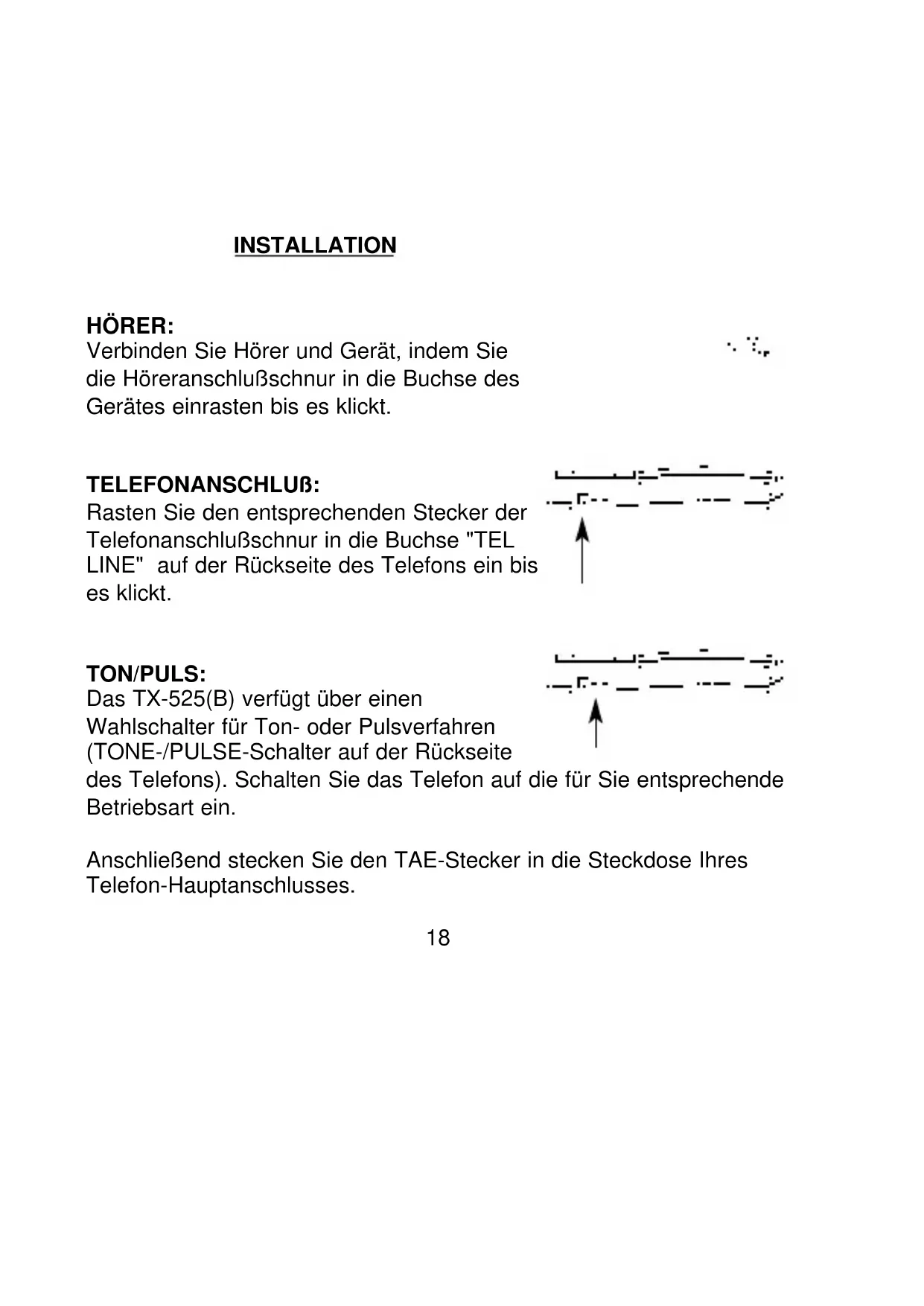 INCOMING CALLS: The volume of an incoming call can be adjus- ted by the ringer switch on the backside of the unit. Lift the handset and start the conversation. OUTGOING CALLS: Lift the handset and wait for the dialtone. Key in the desired telephone number. HANDSFREE DIALLING: Press key H/F to switch on the handsfree dialing function. You may now dial a num- ber without having to hold the handset. As soon as the other party answers your call, lift the handset to start the conversation. LAST NUMBER REDIAL: Lift the handset and wait for the dialtone. Press the REDIAL button; the TX-525(B) now automatically redials the last dialed number. 15PAUSE: In case you are calling through a PABX, it is preferable to press the REDIAL button direct after the prefix (mostly 0). NOTE: If this key is pressed BEFORE one of the number buttons has been pressed, then this key acts as a REDIAL key. HOLD: Press HOLD to temporary switch-off the micro- phone. You may now replace the handset on the cradle. Lift the handset to resume the conversation. TELESERVICE BUTTON: If your telephone is set to pulse dialing, press button */TONE to temporary switch to tone-dia- ling. Tone dialing is required to gain access to computer services. If the TX-525(B) is already set to tone-dialing, then you can directly make use of computer services. 16R/FLASH: The TX-525(B) has a R/FLASH button to transfer calls when connected to a PABX or to gain access to special services from your provider. Consult the manual of your PABX or consult your provider. The FLASH time is 100 mS. MAINTENANCE Do not place the telephone in direct sunlight nor in wet surroundings. Clean the cabinet only with a damp cloth; do not use chemical clean- sers. Do not place the TX-525(B) on a cellulose based surface; the rubber feet can damage the surface. Avoid placing in Electro-magnetic fields; this might influence the audio- quality. 17INSTALLATION HÖRER: Verbinden Sie Hörer und Gerät, indem Sie die Höreranschlußschnur in die Buchse des Gerätes einrasten bis es klickt. TELEFONANSCHLUß: Rasten Sie den entsprechenden Stecker der Telefonanschlußschnur in die Buchse "TEL LINE" auf der Rückseite des Telefons ein bis es klickt. TON/PULS: Das TX-525(B) verfügt über einen Wahlschalter für Ton- oder Pulsverfahren (TONE-/PULSE-Schalter auf der Rückseite des Telefons). Schalten Sie das Telefon auf die für Sie entsprechende Betriebsart ein. Anschließend stecken Sie den TAE-Stecker in die Steckdose Ihres Telefon-Hauptanschlusses. 18GEBRAUCH EINGEHENDES GESPRÄCH: Die Tonruflautstärke stellen Sie mit dem Lautstärkeschalter auf der Rückseite des Gerätes ein. Nehmen Sie den Hörer ab und beginnen das Gespräch. AUSGEHENDES GESPRÄCH: Nehmen Sie den Hörer ab und warten bis der Wahlton ertönt. Geben Sie mittels Tastatur die Rufnummer ein. HANDFREI TELEFONIEREN: Sie haben die Möglichkeit, Telefongespräche mit aufgelegtem Hörer zu führen. Die Handfrei-Funktion schalten Sie mit der Taste H/F ein. Wenn der Angerufene sich meldet, neh- men Sie der Hörer ab und führen das Gespräch. 19WAHLWIEDERHOLUNG: Die zuletzt eingegeben Rufnummer wird vom TX-525(B) gespeichert. 1.Nehmen Sie den Hörer ab oder schalten die Handfrei-Funktion ein. 2.Drücken Sie, wenn der Wahlton ertönt, die Taste REDIAL. 3.Die zuletzt gewählte Rufnummer wird jetzt automatisch nochmal gewählt. Wenn Sie die zuletzt gewählte Rufnummer nicht speichern lassen wol- len, nehmen Sie nach Beendigung des Gespräches den Hörer wieder auf und wählen eine 0. Die 0 wird dann als zuletzt gewählte Rufnummer gespeichert. PAUSE: Wenn Ihr Telefon an einer Haus- oder Büro-Telefonanlage angesch- lossen ist, kann eine Wählpause (z.B. nach Eingabe der Landes- oder Ortskennziffer oder vor der Durchwahlnummer) durch Drücken der PAUSE-Taste eigegeben werden. Das Gerät wartet jetzt kurz, so daß der Wählton genügend Zeit hat, um weitergeleitet zu werden. Diese Pause wird automatisch gespeichert. Wenn bei der Wahlwiederholung eine Rufnummer mit Pause gewählt wird, unter- bricht das Gerät den Wählvorgang an der betreffenden Stelle, um ihn dann automatisch bis zum Ende der Rufnummer durchzuführen. 20STUMMSCHALTEN: Manchmal soll ein Telefonpartner kurzzeitig nicht mithören, was Sie im Zimmer zu bespre- chen haben. 1.Drücken Sie während des Telefongespräches die HOLD-Taste. 2.Das Gerät ist jetzt stummgeschaltet, Ihr Telefonpartner kann nicht mithören und die Indikator-LED leuchtet. 3.Sie können jetzt den Hörer auflegen, ohne die Verbindung zu unterbrechen. 4.Wenn Sie das Gespräch fortführen möchten, nehmen Sie den Hörer ab, oder, wenn der Hörer nicht aufgelegt wurde, drücken Sie noch- mal die HOLD-Taste, um das Gespräch fortzusetzen. TELEDIENSTE: Anrufe bei Computerdienste usw. erfordern meistens die Eingabe von Tonsignalen. Wenn Sie Ihr Telefon im konventionellen Pulsverfahren betreiben, drücken Sie nachdem die Verbindung mit dem Computerdienst zustande gekommen ist einmal die */TONE- Taste. Alle Tastenbetätigungen werden jetzt in Form von Tonsignale weitergeleitet. 21R/FLASH: Das TX-525(B) ist mit eine R/FLASH- Taste (Unterbrechungszeit 100mS) ausge- stattet. Mittels dieser Taste können Sie bei einige Büro- oder Hauszentralen Gespräche weiterleiten oder zukunftige Netzwerkdienste anrufen.