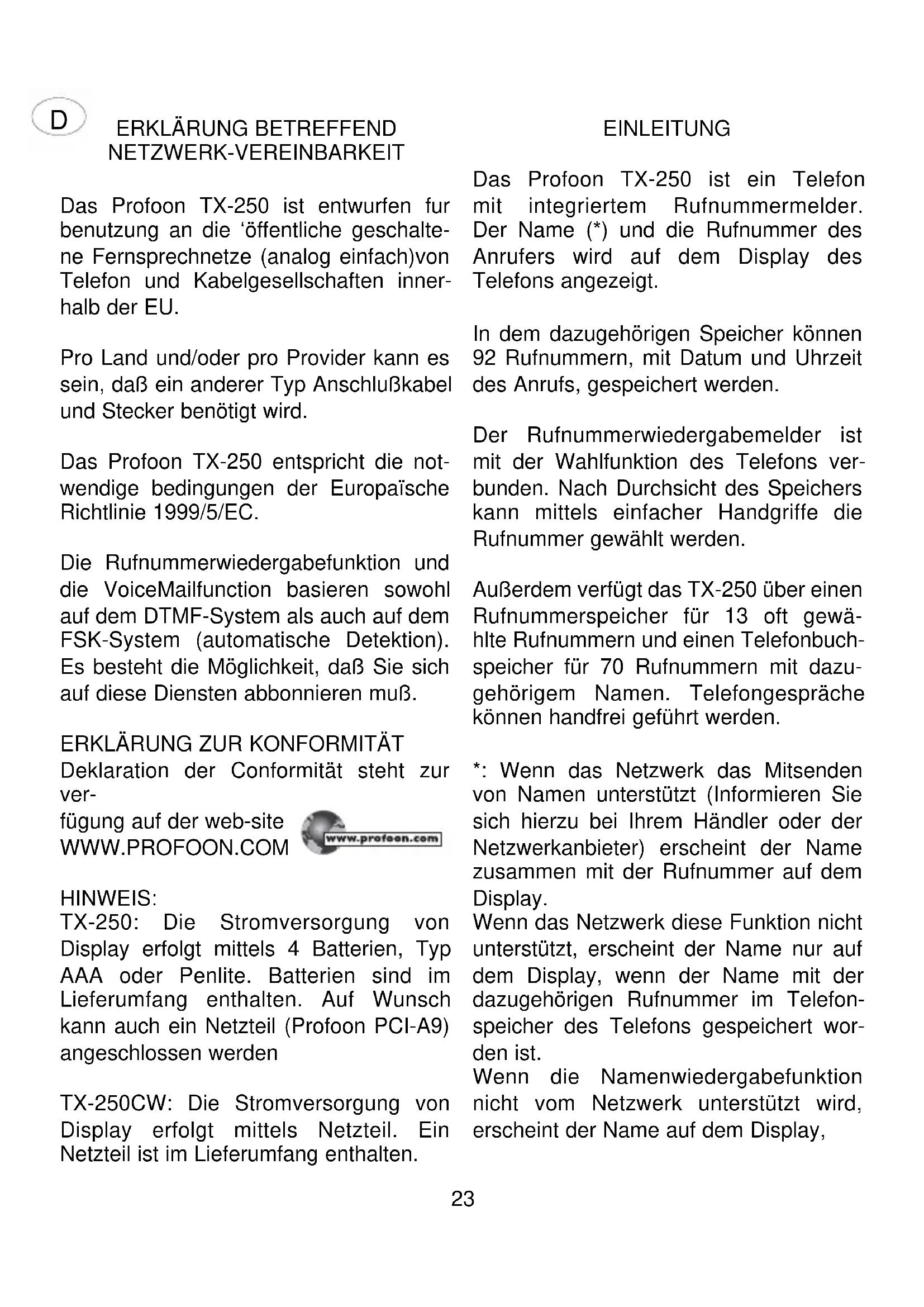 Das Profoon TX-250 ist entwickeln fur benutzung an die 'oppentliche geschalte Fernsprechnetze (analog einfach)von Telefon und Kabelgesellschaften innerhalb der EU.