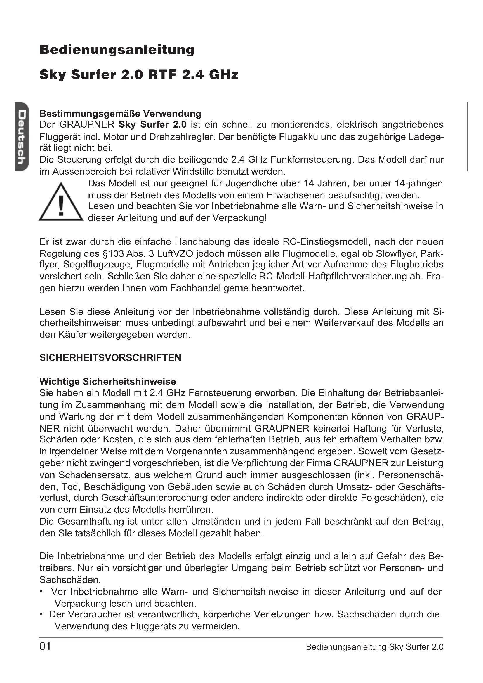 63Bedienungsanleitung Sky Surfer 2.0 RTF 2.4 GHz Bestimmungsgemäße Verwendung Der GRAUPNER Sky Surfer 2.0 ist ein schnell zu montierendes, elektrisch angetriebenes Fluggerät incl. Motor und Drehzahlregler. Der benötigte Flugakku und das zugehörige Ladege- rät liegt nicht bei. Die Steuerung erfolgt durch die beiliegende 2.4 GHz Funkfernsteuerung. Das Modell darf nur im Aussenbereich bei relativer Windstille benutzt werden. Das Modell ist nur geeignet für Jugendliche über 14 Jahren, bei unter 14-jährigen muss der Betrieb des Modells von einem Erwachsenen beaufsichtigt werden. Lesen und beachten Sie vor Inbetriebnahme alle Warn- und Sicherheitshinweise in dieser Anleitung und auf der Verpackung! Er ist zwar durch die einfache Handhabung das ideale RC-Einstiegsmodell, nach der neuen Regelung des §103 Abs. 3 LuftVZO jedoch müssen alle Flugmodelle, egal ob Slowfl yer, Park- fl yer, Segelfl ugzeuge, Flugmodelle mit Antrieben jeglicher Art vor Aufnahme des Flugbetriebs versichert sein. Schließen Sie daher eine spezielle RC-Modell-Haftpfl ichtversicherung ab. Fra- gen hierzu werden Ihnen vom Fachhandel gerne beantwortet. Lesen Sie diese Anleitung vor der Inbetriebnahme vollständig durch. Diese Anleitung mit Si- cherheitshinweisen muss unbedingt aufbewahrt und bei einem Weiterverkauf des Modells an den Käufer weitergegeben werden. SICHERHEITSVORSCHRIFTEN Wichtige Sicherheitshinweise Sie haben ein Modell mit 2.4 GHz Fernsteuerung erworben. Die Einhaltung der Betriebsanlei- tung im Zusammenhang mit dem Modell sowie die Installation, der Betrieb, die Verwendung und Wartung der mit dem Modell zusammenhängenden Komponenten können von GRAUP- NER nicht überwacht werden. Daher übernimmt GRAUPNER keinerlei Haftung für Verluste, Schäden oder Kosten, die sich aus dem fehlerhaften Betrieb, aus fehlerhaftem Verhalten bzw. in irgendeiner Weise mit dem Vorgenannten zusammenhängend ergeben. Soweit vom Gesetz- geber nicht zwingend vorgeschrieben, ist die Verpfl ichtung der Firma GRAUPNER zur Leistung von Schadensersatz, aus welchem Grund auch immer ausgeschlossen (inkl. Personenschä- den, Tod, Beschädigung von Gebäuden sowie auch Schäden durch Umsatz- oder Geschäfts- verlust, durch Geschäftsunterbrechung oder andere indirekte oder direkte Folgeschäden), die von dem Einsatz des Modells herrühren. Die Gesamthaftung ist unter allen Umständen und in jedem Fall beschränkt auf den Betrag, den Sie tatsächlich für dieses Modell gezahlt haben. Die Inbetriebnahme und der Betrieb des Modells erfolgt einzig und allein auf Gefahr des Be- treibers. Nur ein vorsichtiger und überlegter Umgang beim Betrieb schützt vor Personen- und Sachschäden.