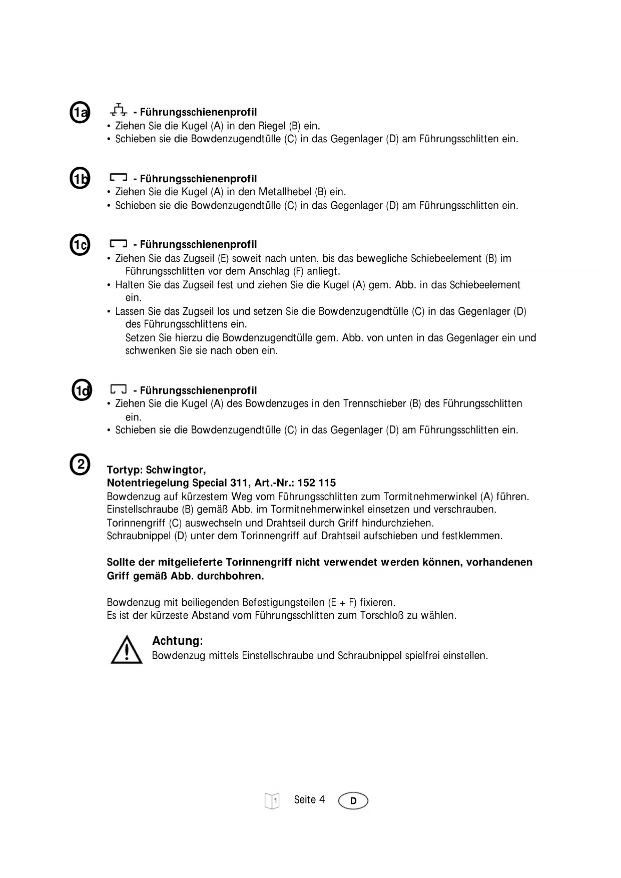 - Schieben sie die Bowdenzugendtülle (C) in das Gegenlager (D) am Führungsschlitten ein. Tortyp: Schwingtor, Notentriegelung Special 311, Art.-Nr.: 152 115 Bowdenzug auf kürzestem Weg vom Führungsschlitten zum Tormitnehmerwinkel (A) führen. Einstellschraube (B) gemäß Abb. im Tormitnehmerwinkel einsetzen und verschrauben. Torinnengriff (C) auswechseln und Drahtseil durch Griff hindurchziehen. Schraubnippel (D) unter dem Torinnengriff auf Drahtseil aufschieben und festklemmen. Sollte der mitgelieferte Torinnengriff nicht verwendet werden können, vorhandenen Griff gemäß Abb. durchbohren. Bowdenzug mit beiliegenden Befestigungsteilen (E + F) fixieren. Es ist der kürzeste Abstand vom Führungsschlitten zum Torschloß zu wählen. Achtung: Bowdenzug mittels Einstellschraube und Schraubnippel spielfrei einstellen.