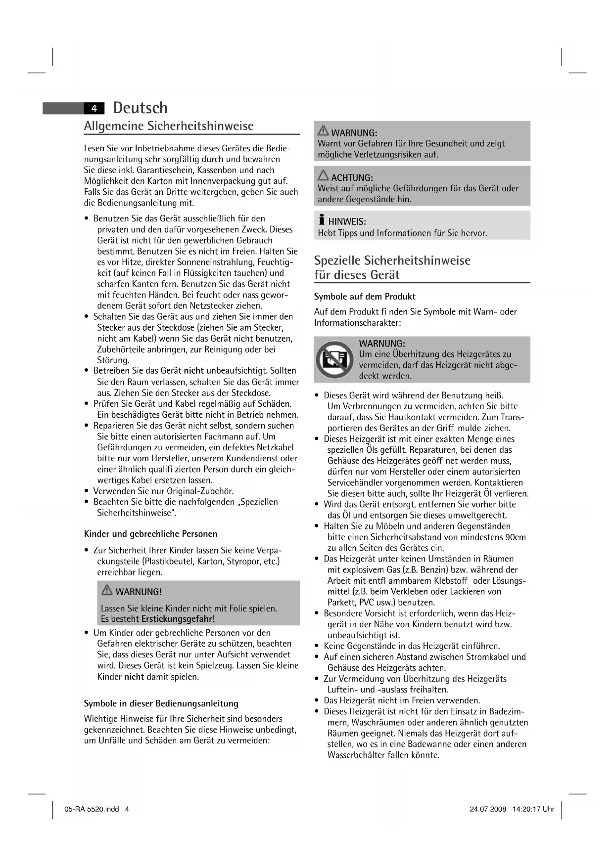 - Dieses Heizgerät ist nicht für den Einsatz in Badezim- mern, Waschräumen oder anderen ähnlich genutzten Räumen geeignet. Niemals das Heizgerät dort auf- stellen, wo es in eine Badewanne oder einen anderen Wasserbehälter fallen könnte. 05-RA 5520.indd 405-RA 5520.indd 4 24.07.2008 14:20:17 Uhr24.07.2008 14:20:17 UhrDeutsch