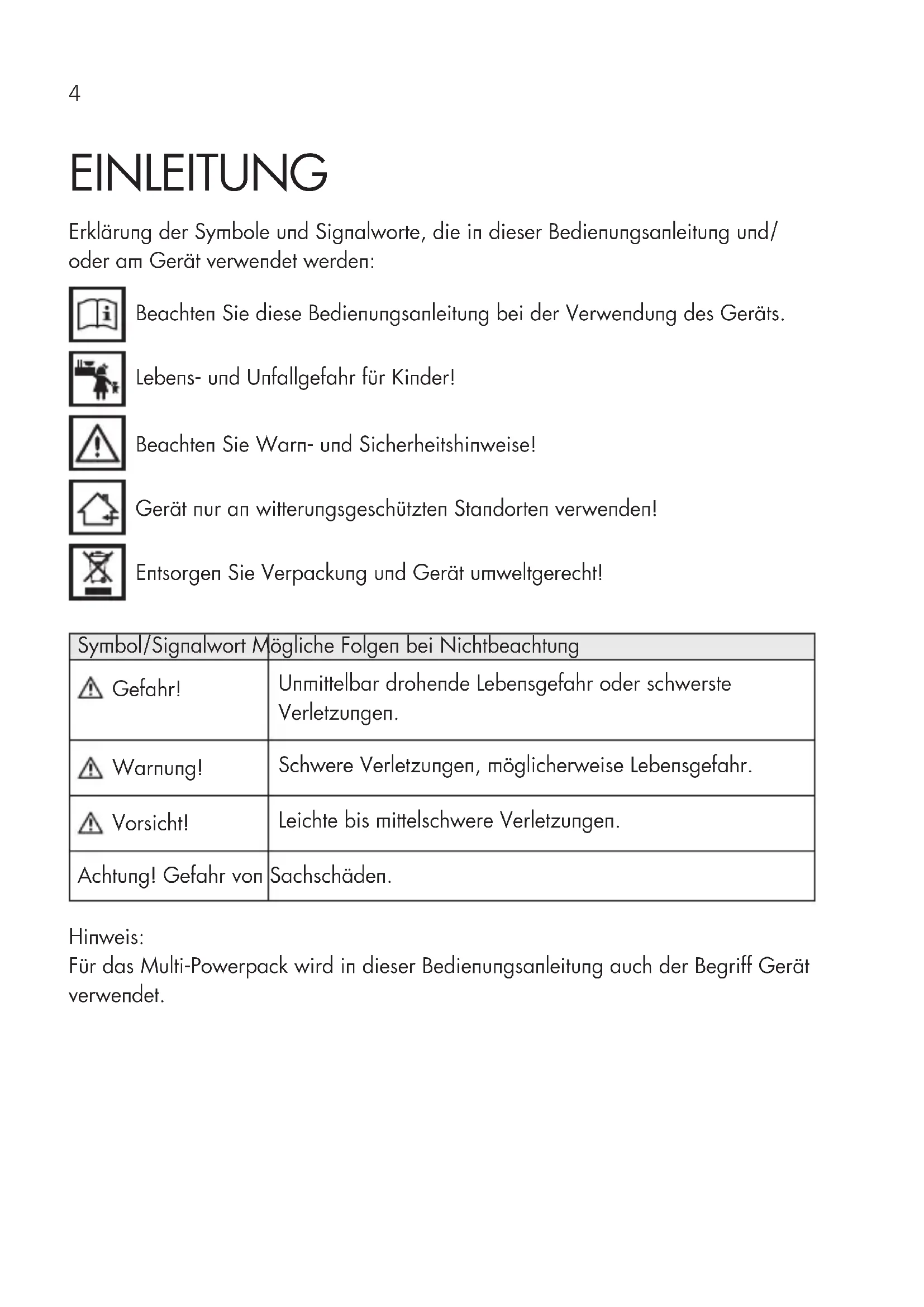 - Entsorgung DE4 EINLEITUNG Erklärung der Symbole und Signalworte, die in dieser Bedienungsanleitung und/ oder am Gerät verwendet werden: Beachten Sie diese Bedienungsanleitung bei der Verwendung des Geräts. Lebens- und Unfallgefahr für Kinder! Beachten Sie Warn- und Sicherheitshinweise! Gerät nur an witterungsgeschützten Standorten verwenden! Entsorgen Sie Verpackung und Gerät umweltgerecht! Symbol/Signalwort Mögliche Folgen bei Nichtbeachtung Gefahr! Unmittelbar drohende Lebensgefahr oder schwerste Verletzungen. Warnung! Schwere Verletzungen, möglicherweise Lebensgefahr. Vorsicht! Leichte bis mittelschwere Verletzungen. Achtung! Gefahr von Sachschäden. Hinweis: Für das Multi-Powerpack wird in dieser Bedienungsanleitung auch der Begriff Gerät verwendet.DE p. 13