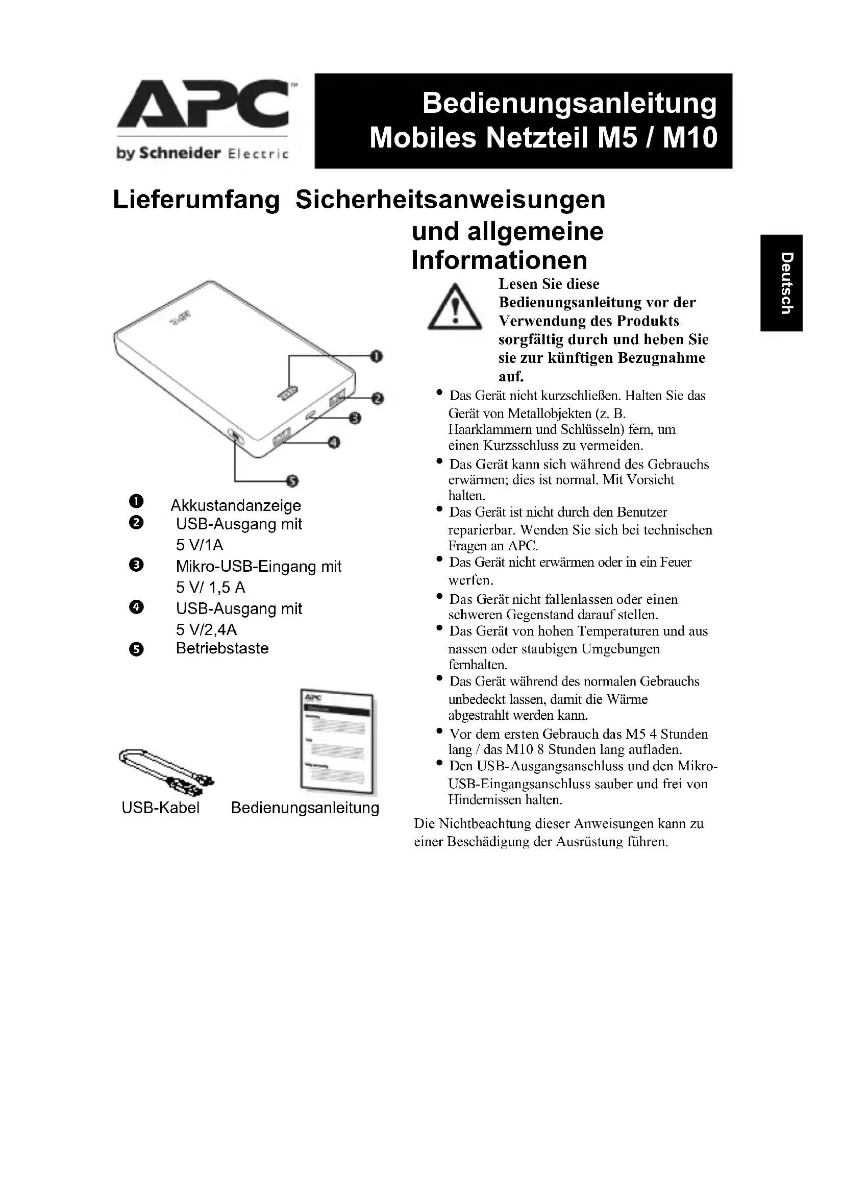 Bedienungsanleitung Mobiles Netzteil M5 / M10 Lieferumfang Sicherheitsanweisungen und allgemeine Informationen