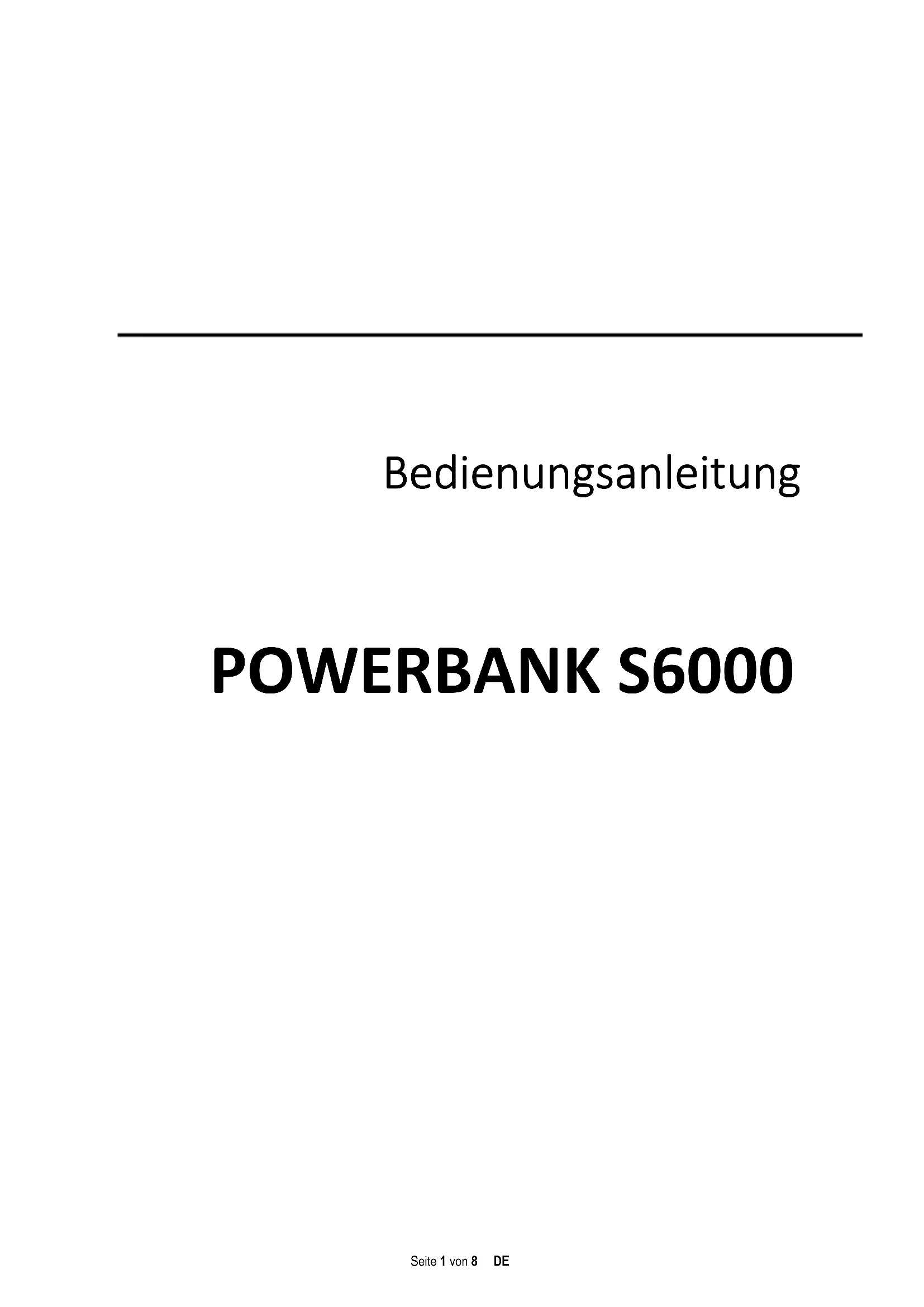 POWERBANK S6000Seite 2 von 8 DE Zu dieser Anleitung: Lesen Sie diese Anleitung sorgfältig durch und beachten und befolgen Sie bitte sämtliche in dieser Anleitung erwähnten Hinweise, um eine lange Lebensdauer und eine zuverlässige Nutzung des Gerätes zu gewährleisten. Heben Sie diese Anleitung griffbereit auf und geben Sie sie an andere Nutzer des Gerätes weiter. Bestimmungsgemäße Verwendung Diese Powerbank ist ausschließlich zur Stromversorgung von Geräten mit einer Betriebsspannung von 5V Gleichstrom (Mobiltelefone, MP3-Player, etc.) bestimmt. Eine andere oder darüber hinausgehende Benutzung gilt als nicht bestimmungsgemäß und kann zu Beschädigungen und Verletzungen führen. Ansprüche jeglicher Art wegen Schäden aus nicht bestimmungsgemäßer Verwendung sind ausgeschlossen. Um Fehlfunktionen zu vermeiden, verbinden Sie die USB- Ausgangsanschlüsse des Gerätes nicht mit USB Anschlüssen von Computern oder anderen Geräten. Sie sind nur zum Aufladen von Geräten bestimmt. Zerlegen Sie das Gerät nicht in seine Einzelteile, und versuchen Sie nicht, es selbst zu reparieren. Es enthält keine zu wartenden Teile und die Garantie erlischt in diesem Falle. Stecken Sie keine Gegenstände, die nicht für den Gebrauch vorgesehen sind, in die Öffnungen des Produkts. Es besteht die Gefahr eines Kurzschlusses. Bedienen Sie dieses Gerät nicht mit nassen Händen. Verwenden Sie bitte kein Wasser oder chemische Lösungen, um das Gerät zu säubern. Nutzen Sie dazu bitte nur ein trockenes Tuch. Das Gerät entwickelt bei der Nutzung Wärme, dies ist normal. Decken Sie das Produkt während der Nutzung nicht ab. Benutzen Sie das Gerät nicht, wenn es sichtbare Schäden aufweist oder feucht geworden ist. Sicherheitshinweise: Betriebsbedingungen: Betreiben Sie das Gerät bei 0 bis 40 Grad Celsius bei max. 90 % relativer Luftfeuchtigkeit. Falls Sie die Powerbank längere Zeit nicht benutzen, lagern Sie es zwischen -10 und 45 Grad Celsius bei max. 90 % relativer Luftfeuchtigkeit (für kurze Zeit) und laden Sie dieses alle drei Monate, um die volle Leistungsfähigkeit zu erhalten.Seite 3 von 8 DE Verwenden Sie das Gerät nicht in extrem kalten, heißen, feuchten oder staubigen Gebieten. Setzen Sie es ebenfalls keinen direkten Sonnenstrahlen aus. Schützen Sie das Produkt vor offenem Feuer. Es besteht Explosionsgefahr!