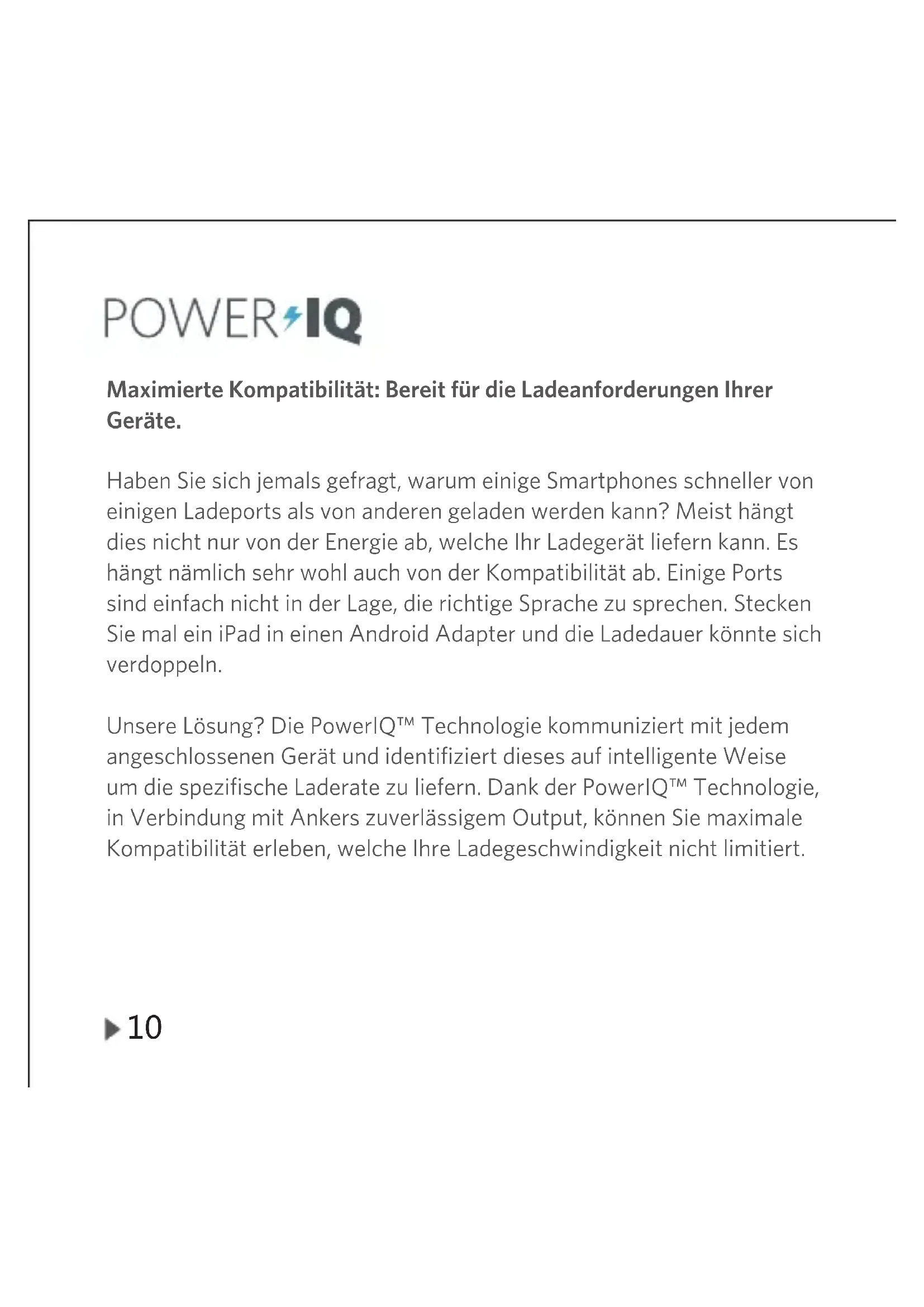 Please note that unauthorized reselling of Anker products is prohibited.10 Maximierte Kompatibilität: Bereit für die Ladeanforderungen Ihrer Geräte. Haben Sie sich jemals gefragt, warum einige Smartphones schneller von einigen Ladeports als von anderen geladen werden kann? Meist hängt dies nicht nur von der Energie ab, welche Ihr Ladegerät liefern kann. Es hängt nämlich sehr wohl auch von der Kompatibilität ab. Einige Ports sind einfach nicht in der Lage, die richtige Sprache zu sprechen. Stecken Sie mal ein iPad in einen Android Adapter und die Ladedauer könnte sich verdoppeln. Unsere Lösung? Die PowerIQ™ Technologie kommuniziert mit jedem angeschlossenen Gerät und identifiziert dieses auf intelligente Weise um die spezifische Laderate zu liefern. Dank der PowerIQ™ Technologie, in Verbindung mit Ankers zuverlässigem Output, können Sie maximale Kompatibilität erleben, welche Ihre Ladegeschwindigkeit nicht limitiert.11 Packungsinhalt