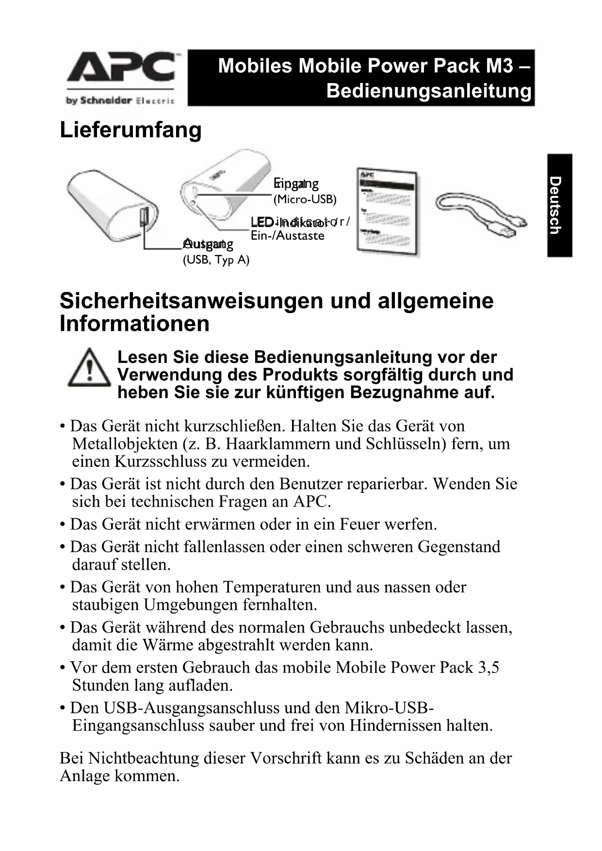 C© 2015 APC by Schneider Electric. APC, und das APC- Logo sind Eigentum von Schneider Electric Industries S.A.S. oder ihren angegliederter Unternehmen. Alle anderen Marken sind Eigentum ihrer jeweiligen Inhaber. DE 990-5593 01/2015 Deutsch Fehlerbehebung APC by Schneider Electric IT – Kundendienst weltweit Länderspezifischen Kundendienst finden Sie auf den APC by Schneider Electric-Internetseiten unter www.apc.com. Problem / mögliche Ursache Lösung Das mobile Mobile Power Pack lässt sich nicht aufladen Möglicherweise funktioniert das USB-Ladegerät nicht richtig oder der Computer befindet sich im Ruhezustand. Versuchen Sie es mit einem anderen USB-Ladegerät oder wecken Sie den Computer aus dem Ruhezustand auf. Das Micro-USB-Kabel und/ oder die Anschlusskontakte sind verschlissen. Versuchen Sie es mit einem neuen Micro-USB-Anschluss Das mobile Mobile Power Pack kann bestimmte Geräte nicht aufladen. Das mobile Mobile Power Pack hat die mit ihm verbundenen Gerät möglicherweise nicht erkannt. Einige USB-Kabel von Drittanbietern funktionieren mit dem M3-Mobile Power Pack möglicherweise nicht richtig. Drücken Sie zur Lösung dieses Problems zum Starten der Geräteaufladung die Ein-/Austaste am M3. Falls das Mobile Power Pack Ihr Gerät immer noch nicht auflädt, ersetzen Sie das Drittanbieterkabel durch das mit Ihrem Gerät gelieferte Originalkabel. Eine Überlastung ist aufgetreten und die orangefarbene M3-LED blinkt. M3 lädt ein Gerät auf und sein USB- Ausgangsstrom übersteigt den angegebenen Bereich. Entfernen Sie das über den M3-Mobile Power Pack aufgeladene Gerät. Die Lebensdauer des mobilen Mobile Power Packs ist abgelaufen oder es ist eine Störung aufgetreten. Wenden Sie sich im Falle eines Systemfehlers an Ihren APC by Schneider Electric-Händler oder einen zugelassenen APC by Schneider Electric-Wartungsbetrieb.Français Inventaire Instructions de sécurité et informations générales Veuillez lire attentivement ce manuel avant d'utiliser le produit et conservez-le pour référence ultérieure.