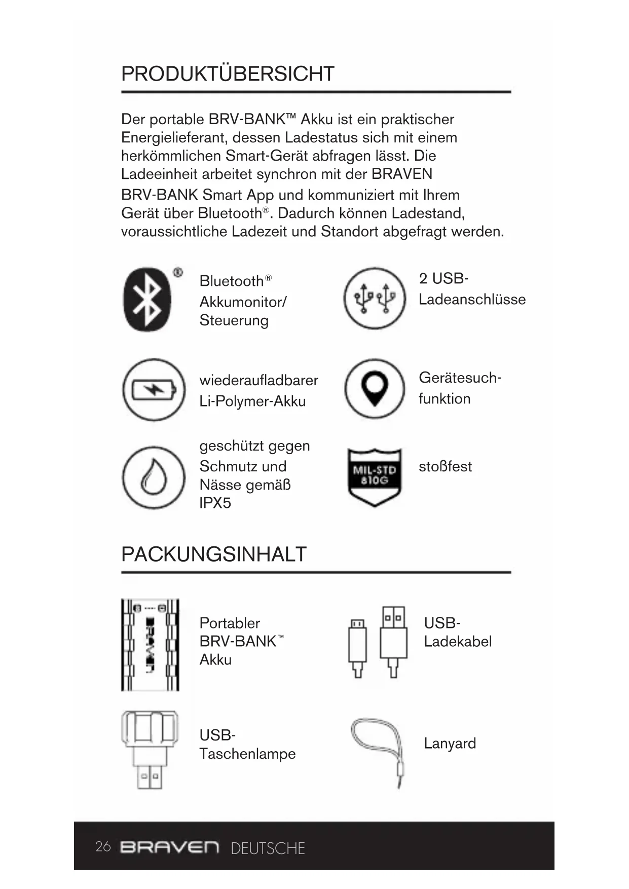 DEUTSCHE PRODUKTÜBERSICHT PACKUNGSINHALT Der portable BRV-BANK™ Akku ist ein praktischer Energielieferant, dessen Ladestatus sich mit einem herkömmlichen Smart-Gerät abfragen lässt. Die Ladeeinheit arbeitet synchron mit der BRAVEN BRV-BANK Smart App und kommuniziert mit Ihrem Gerät über Bluetooth