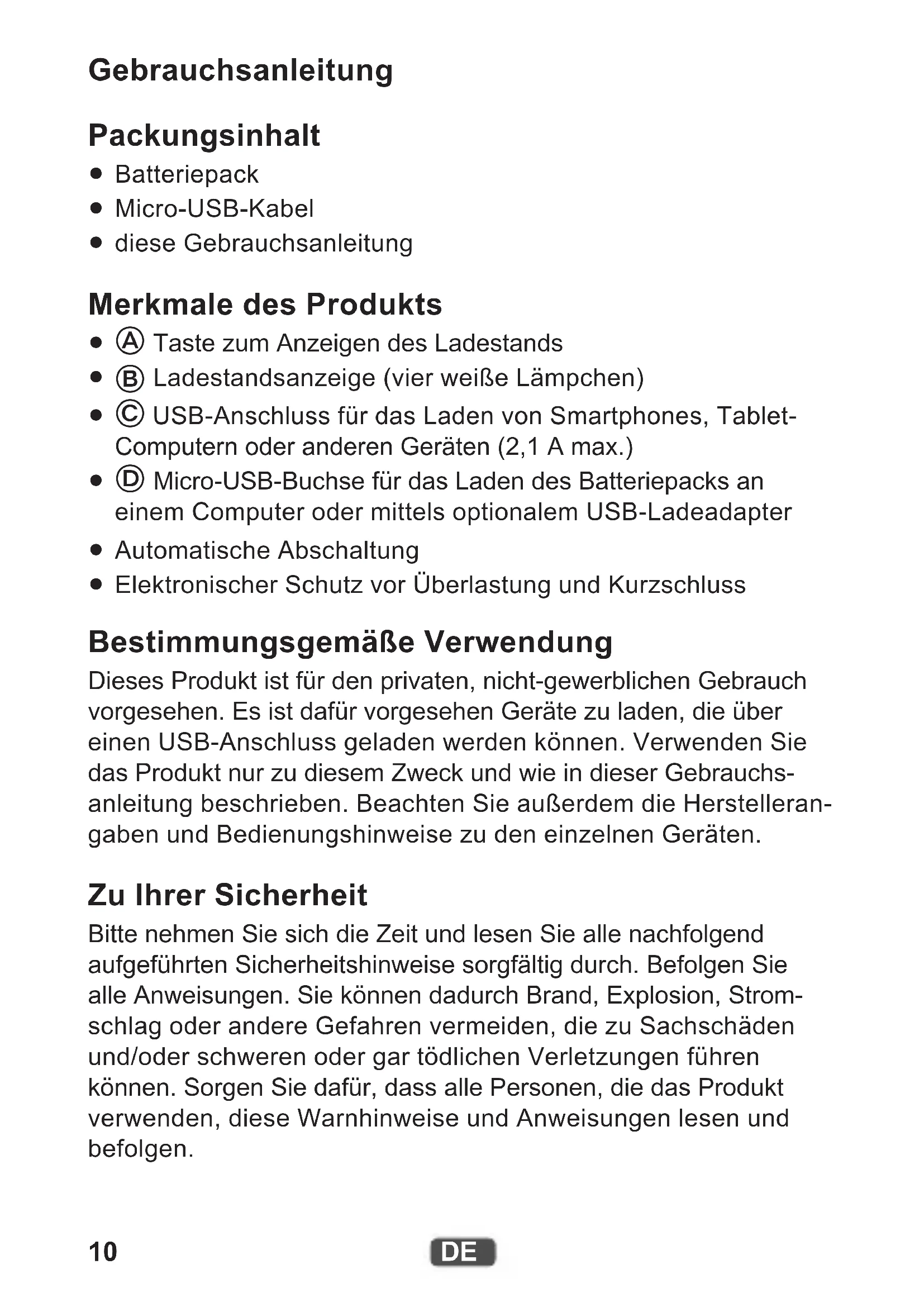 Elektronischer Schutz vor Überlastung und Kurzschluss Bestimmungsgemäße Verwendung Dieses Produkt ist für den privaten, nicht-gewerblichen Gebrauch vorgesehen. Es ist dafür vorgesehen Geräte zu laden, die über einen USB-Anschluss geladen werden können. Verwenden Sie das Produkt nur zu diesem Zweck und wie in dieser Gebrauchs- anleitung beschrieben. Beachten Sie außerdem die Herstelleran- gaben und Bedienungshinweise zu den einzelnen Geräten. Zu Ihrer Sicherheit Bitte nehmen Sie sich die Zeit und lesen Sie alle nachfolgend aufgeführten Sicherheitshinweise sorgfältig durch. Befolgen Sie alle Anweisungen. Sie können dadurch Brand, Explosion, Strom- schlag oder andere Gefahren vermeiden, die zu Sachschäden und/oder schweren oder gar tödlichen Verletzungen führen können. Sorgen Sie dafür, dass alle Personen, die das Produkt verwenden, diese Warnhinweise und Anweisungen lesen und befolgen.11