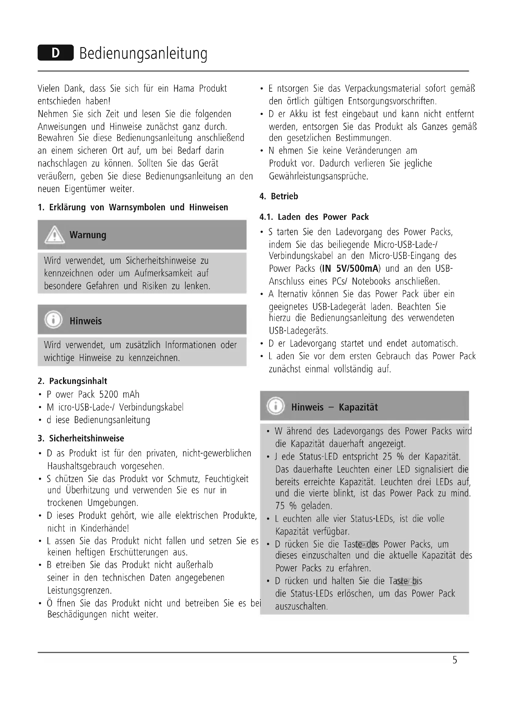Note on environmental protection: After the implementation of the European Directive 2012/19/EU and 2006/66/EU in the national legal system, the following applies: Electric and electronic devices as well as batteries must not be disposed of with household waste. Consumers are obliged by law to return electrical and electronic devices as well as batteries at the end of their service lives to the public collecting points set up for this purpose or point of sale. Details to this are dened by the national law of the respective country. This symbol on the product, the instruction manual or the package indicates that a product is subject to these regulations. By recycling, reusing the materials or other forms of utilising old devices/Batteries, you are making an important contribution to protecting our environment.5 D Bedienungsanleitung Vielen Dank, dass Sie sich für ein Hama Produkt entschieden haben! Nehmen Sie sich Zeit und lesen Sie die folgenden Anweisungen und Hinweise zunächst ganz durch. Bewahren Sie diese Bedienungsanleitung anschließend an einem sicheren Ort auf, um bei Bedarf darin nachschlagen zu können. Sollten Sie das Gerät veräußern, geben Sie diese Bedienungsanleitung an den neuen Eigentümer weiter.