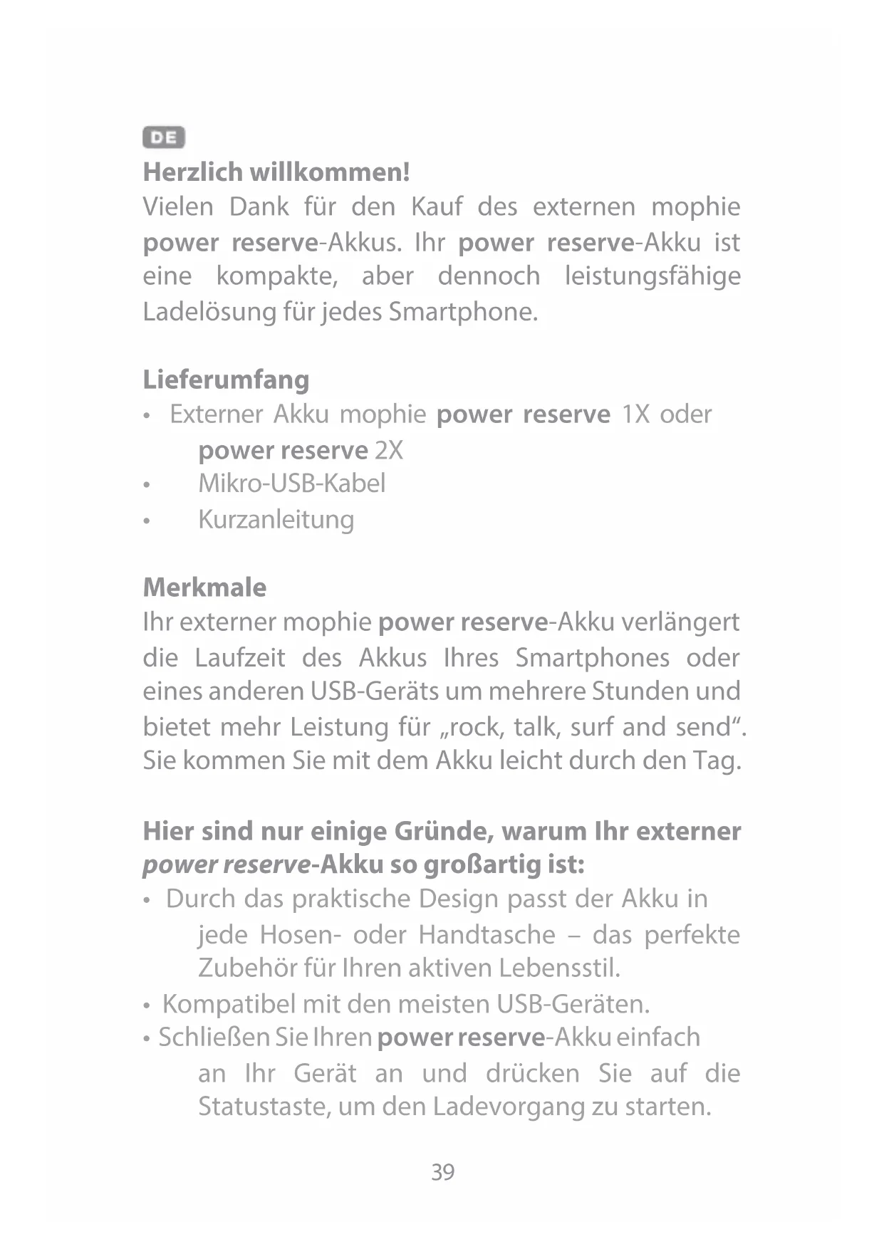 - Kurzanleitung Merkmale Ihr externer mophie power reserve-Akku verlängert die Laufzeit des Akkus Ihres Smartphones oder eines anderen USB-Geräts um mehrere Stunden und bietet mehr Leistung für „rock, talk, surf and send“. Sie kommen Sie mit dem Akku leicht durch den Tag. Hier sind nur einige Gründe, warum Ihr externer power reserve-Akku so großartig ist: