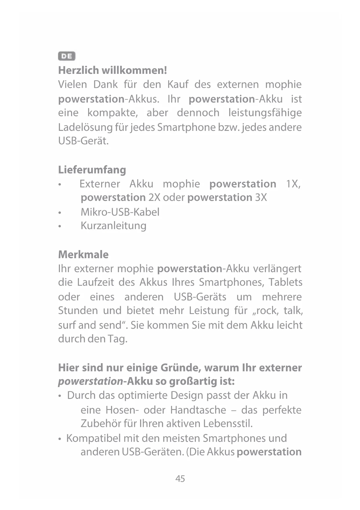 - Kurzanleitung Merkmale Ihr externer mophie powerstation-Akku verlängert die Laufzeit des Akkus Ihres Smartphones, Tablets oder eines anderen USB-Geräts um mehrere Stunden und bietet mehr Leistung für „rock, talk, surf and send“. Sie kommen Sie mit dem Akku leicht durch den Tag. Hier sind nur einige Gründe, warum Ihr externer powerstation-Akku so großartig ist: