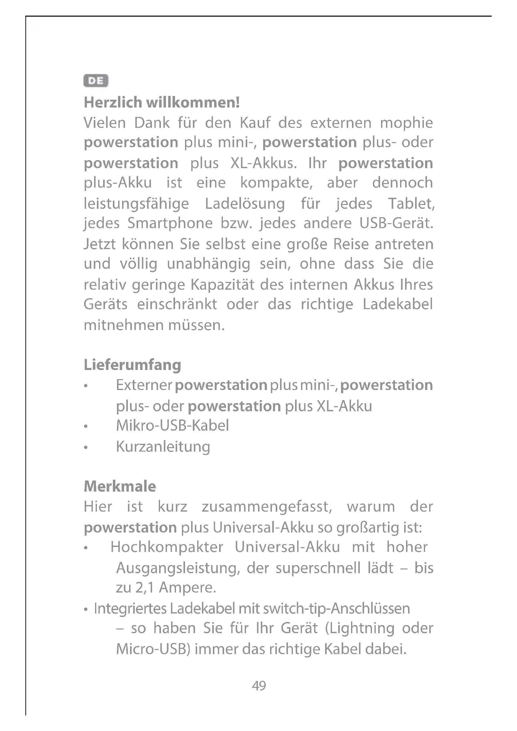 Vielen Dank für den Kauf des externen mophie powerstation plus mini-, powerstation plus- oder powerstation plus XL-Akkus. Ihr powerstation plus-Akku ist eine kompakte, aber dennoch leistungsfähige Ladelösung für jedes Tablet, jedes Smartphone bzw. jedes andere USB-Gerät. Jetzt können Sie selbst eine große Reise antreten und völlig unabhängig sein, ohne dass Sie die relativ geringe Kapazität des internen Akkus Ihres Geräts einschränkt oder das richtige Ladekabel mitnehmen müssen.