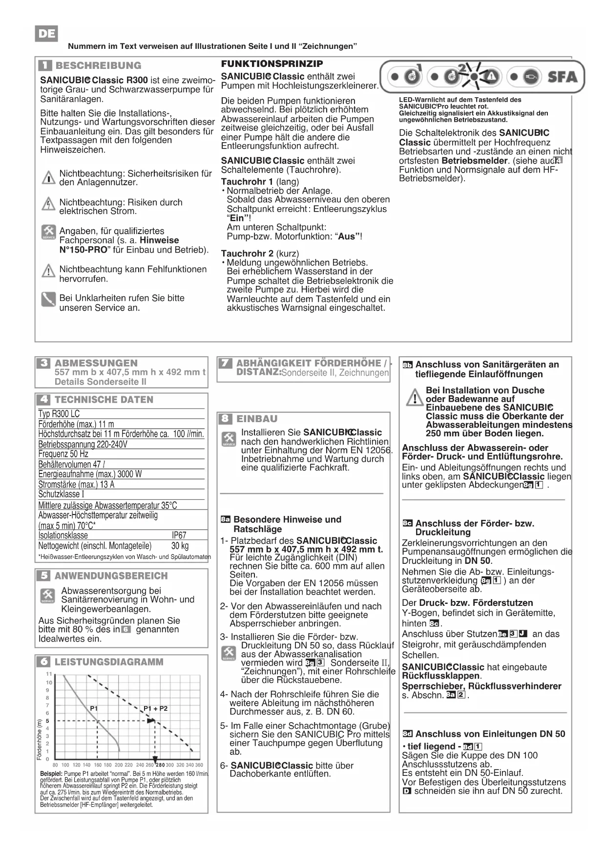 Classic R300 ist eine zweimo- torige Grau- und Schwarzwasserpumpe für Sanitäranlagen. Bitte halten Sie die Installations-, Nutzungs- und Wartungsvorschriften dieser Einbauanleitung ein. Das gilt besonders für Textpassagen mit den folgenden Hinweiszeichen. Nichtbeachtung: Sicherheitsrisiken für den Anlagennutzer. Nichtbeachtung: Risiken durch elektrischen Strom. Angaben, für qualifiziertes Fachpersonal (s. a. Hinweise N°150-PRO” für Einbau und Betrieb). Nichtbeachtung kann Fehlfunktionen hervorrufen. Bei Unklarheiten rufen Sie bitte unseren Service an.