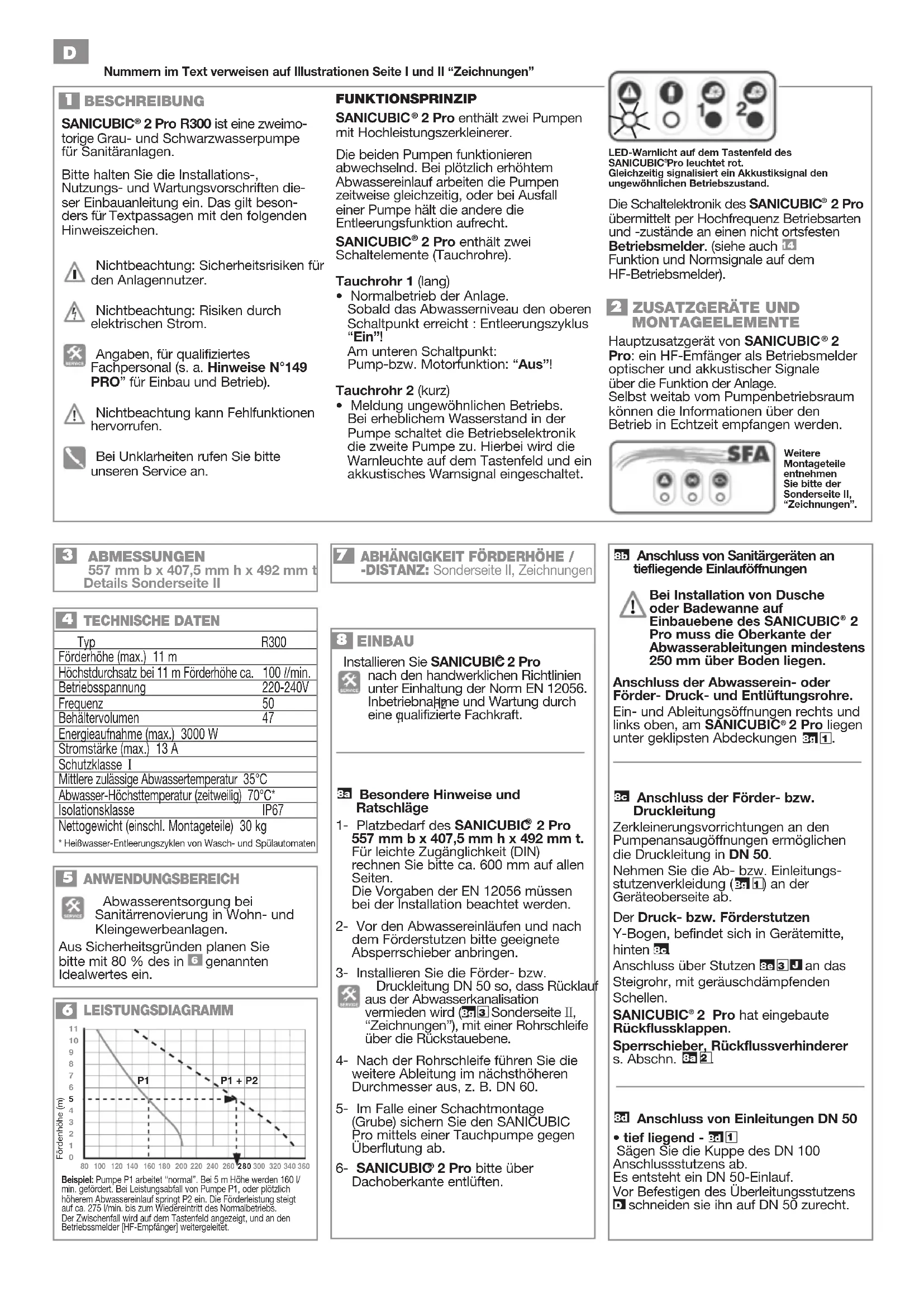 2 Pro nach den handwerklichen Richtlinien unter Einhaltung der Norm EN 12056. Inbetriebnahme und Wartung durch eine qualifizierte Fachkraft.