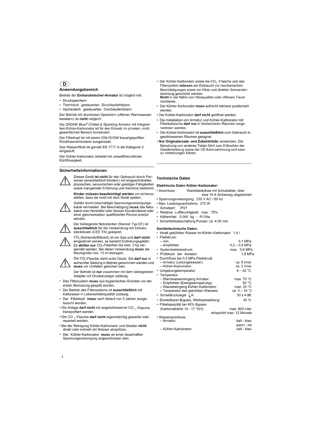 Chilled & Sparkling Armatur mit integrier- tem Kühler-Karbonator ist für den Einsatz im privaten, nicht gewerblichen Bereich konstruiert. Der Filterkopf ist mit einem DIN-DVGW bauartgeprüften Rückflussverhinderer ausgerüstet. Das Wasserfiltrat ist gemäß EN 1717 in die Kategorie 2 eingestuft. Der Kühler-Karbonator arbeitet mit umweltfreundlicher Kühlflüssigkeit. Sicherheitsinformationen Dieses Gerät ist nicht für den Gebrauch durch Per- sonen (einschließlich Kindern) mit eingeschränkten physischen, sensorischen oder geistigen Fähigkeiten sowie mangelnder Erfahrung und Kenntnis bestimmt. Kinder müssen beaufsichtigt werden um sicherzu- stellen, dass sie nicht mit dem Gerät spielen. Gefahr durch beschädigte Spannungsversorgungs- kabel vermeiden. Bei Beschädigung muss das Netz- kabel vom Hersteller oder dessen Kundendienst oder einer gleichermaßen qualifizierten Person ersetzt werden. Der beiliegende Netzstecker (Stecker Typ EF) ist ausschließlich für die Verwendung mit Schuko- steckdosen (CEE 7/4) geeignet.