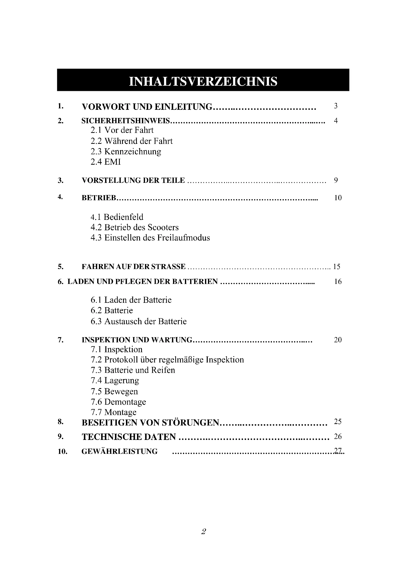 ■ Für die Nutzung dieses Fahrzeugs gelten die gleichen Verkehrsregeln wie für Fußgänger ♦ Zu Ihrer Sicherheit befolgen und beachten Sie bitte die gleichen Verkehrsregeln wie Fußgänger. ♦ Fahren Sie den Scooter nicht, wenn Sie Alkohol getrunken haben oder müde sind. ♦ Seien Sie vorsichtig, wenn Sie den Scooter in schlechten Lichtverhältnissen fahren. Er ist nicht für die Nutzung während der Nacht vorgesehen. ♦ Seien Sie besonders vorsichtig, wenn Sie den Scooter in belebten Zonen oder Einkaufszentren fahren. ♦ Fahren Sie nur auf dem Bürgersteig, einspurigen Straßen oder in Fußgängerzonen. Fahren Sie nie auf Schnellstraßen oder zweispurigen Straßen. ♦ Achten Sie beim Befahren oder Überqueren von Straßen auf den Verkehr. ■ Üben Sie die Bedienung Ihres Fahrzeugs Machen Sie sich mit der Bedienung des Scooters vertraut, bevor Sie ihn in belebten oder möglicherweise gefährlichen Umgebungen verwenden. Üben Sie auf einem großen, freien Gelände, beispielsweise in einem Park. Um Unfälle während der Fahrt mit dem Scooter zu vermeiden, berücksichtigen Sie Fahrbewegungen wie Beschleunigen, Anhalten, Wenden, Rückwärtsfahren, Hoch- und Herunterfahren von Rampen. ♦ Drehen Sie den Geschwindigkeitsregler zum Üben anfangs auf den minimalen Wert. ♦ Lassen Sie sich aus Sicherheitsgründen von jemandem begleiten, wenn Sie zum ersten Mal auf der Straße fahren. ♦ Nutzen Sie die höhere Geschwindigkeitseinstellung erst, wenn Sie sicher sind, dass Sie Ihren Scooter leicht nutzen und steuern können. ■ Der Scooter darf nur von einer Person auf einmal verwendet werden. Befördern Sie keine Passagiere (einschließlich Kindern) auf Ihrem Scooter. ■ Verwenden Sie dieses Fahrzeug nicht zum Tragen oder Schleppen von Gütern ♦ Das maximal zu befördernde Gewicht beträgt 115 kg/250 lbs (einschließlich Fahrer und ggf. Gütern). Siehe „MAX. BELASTUNG“ in „9. TECHNISCHE DATEN“. ♦ Die maximale Last für den Korb beträgt 3 kg (7 lb). ■ Führen Sie tägliche Inspektionen durch. Siehe Abschnitt „TÄGLICHE INSPEKTION“.5