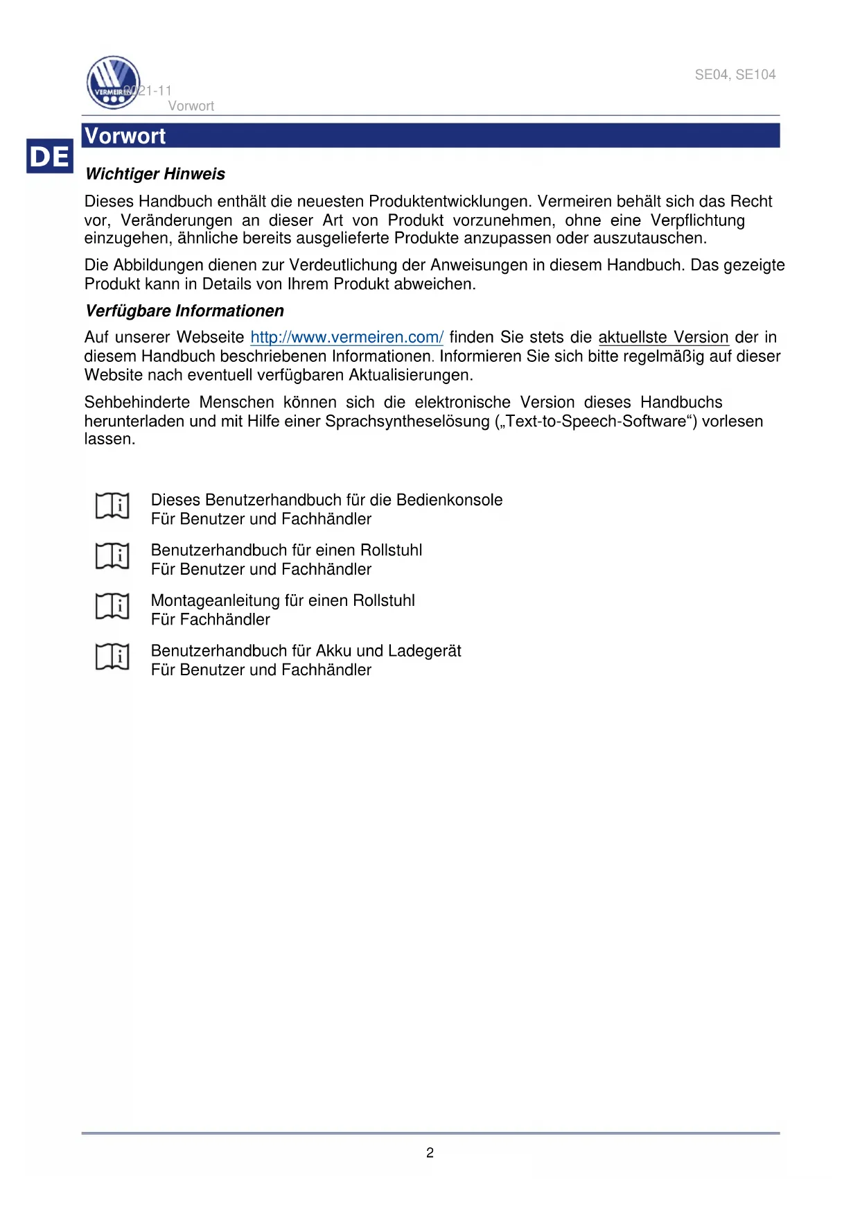 Vorwort Wichtiger Hinweis Dieses Handbuch enthält die neuesten Produktentwicklungen. Vermeiren behält sich das Recht vor, Veränderungen an dieser Art von Produkt vorzunehmen, ohne eine Verpflichtung einzugehen, ähnliche bereits ausgelieferte Produkte anzupassen oder auszutauschen. Die Abbildungen dienen zur Verdeutlichung der Anweisungen in diesem Handbuch. Das gezeigte Produkt kann in Details von Ihrem Produkt abweichen. Verfügbare Informationen Auf unserer Webseite http://www.vermeiren.com/ finden Sie stets die aktuellste Version der in diesem Handbuch beschriebenen Informationen. Informieren Sie sich bitte regelmäßig auf dieser Website nach eventuell verfügbaren Aktualisierungen. Sehbehinderte Menschen können sich die elektronische Version dieses Handbuchs herunterladen und mit Hilfe einer Sprachsyntheselösung („Text-to-Speech-Software“) vorlesen lassen.
