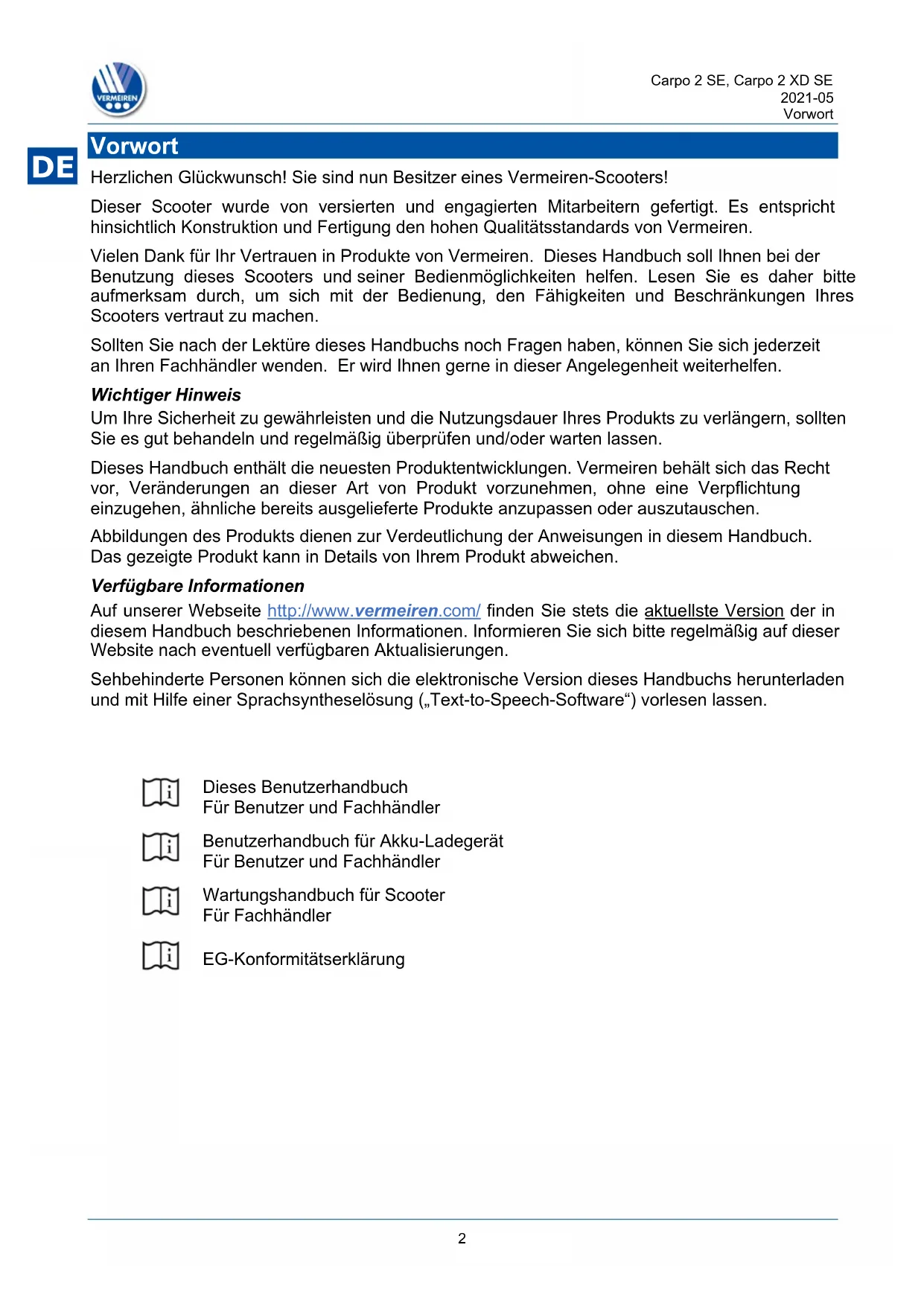 Vorwort Herzlichen Glückwunsch! Sie sind nun Besitzer eines Vermeiren-Scooters! Dieser Scooter wurde von versierten und engagierten Mitarbeitern gefertigt. Es entspricht hinsichtlich Konstruktion und Fertigung den hohen Qualitätsstandards von Vermeiren. Vielen Dank für Ihr Vertrauen in Produkte von Vermeiren. Dieses Handbuch soll Ihnen bei der Benutzung dieses Scooters und seiner Bedienmöglichkeiten helfen. Lesen Sie es daher bitte aufmerksam durch, um sich mit der Bedienung, den Fähigkeiten und Beschränkungen Ihres Scooters vertraut zu machen. Sollten Sie nach der Lektüre dieses Handbuchs noch Fragen haben, können Sie sich jederzeit an Ihren Fachhändler wenden. Er wird Ihnen gerne in dieser Angelegenheit weiterhelfen. Wichtiger Hinweis Um Ihre Sicherheit zu gewährleisten und die Nutzungsdauer Ihres Produkts zu verlängern, sollten Sie es gut behandeln und regelmäßig überprüfen und/oder warten lassen. Dieses Handbuch enthält die neuesten Produktentwicklungen. Vermeiren behält sich das Recht vor, Veränderungen an dieser Art von Produkt vorzunehmen, ohne eine Verpflichtung einzugehen, ähnliche bereits ausgelieferte Produkte anzupassen oder auszutauschen. Abbildungen des Produkts dienen zur Verdeutlichung der Anweisungen in diesem Handbuch. Das gezeigte Produkt kann in Details von Ihrem Produkt abweichen. Verfügbare Informationen Auf unserer Webseite http://www.vermeiren.com/ finden Sie stets die aktuellste Version der in diesem Handbuch beschriebenen Informationen. Informieren Sie sich bitte regelmäßig auf dieser Website nach eventuell verfügbaren Aktualisierungen. Sehbehinderte Personen können sich die elektronische Version dieses Handbuchs herunterladen und mit Hilfe einer Sprachsyntheselösung („Text-to-Speech-Software“) vorlesen lassen.