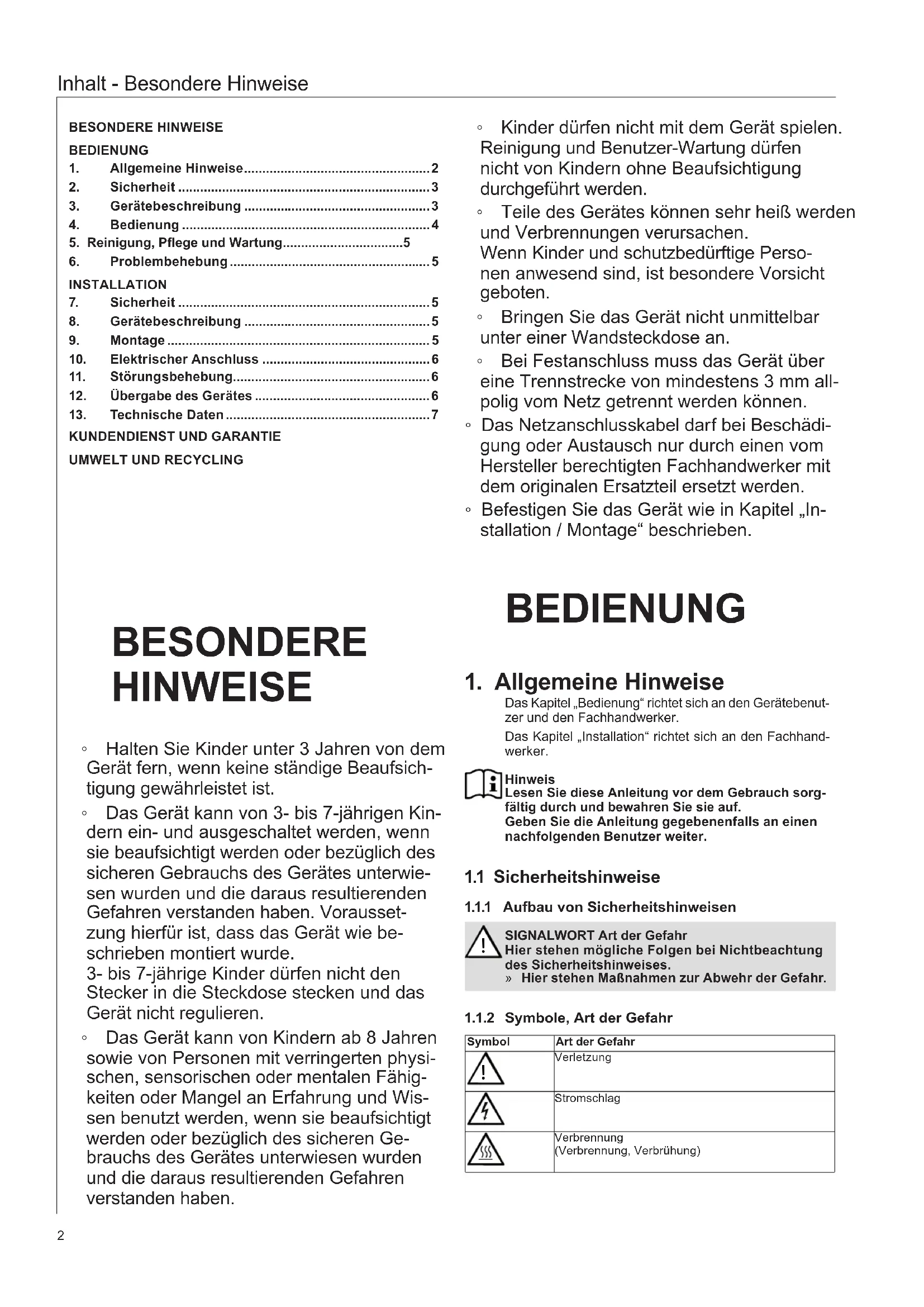 WARNUNG Verletzung º Halten Sie Kinder unter 3 Jahren von dem Gerät fern, wenn keine ständige Beaufsichtigung ge-währleistet ist. º Das Gerät kann von 3- bis 7-jährigen Kindern ein- und ausgeschaltet werden, wenn sie beauf-sichtigt werden oder bezüglich des sicheren Ge-brauchs des Gerätes unterwiesen wurden und die daraus resultierenden Gefahren verstanden haben. Voraussetzung hierfür ist, dass das Gerät wie beschrieben montiert wurde. 3- bis 7-jährige Kinder dürfen nicht den Stecker in die Steckdose stecken und das Gerät nicht regulieren. º Das Gerät kann von Kindern ab 8 Jahren sowie von Personen mit verringerten physischen, sen-sorischen oder mentalen Fähigkeiten oder Man-gel an Erfahrung und Wissen benutzt werden, wenn sie beaufsichtigt werden oder bezüglich des sicheren Gebrauchs des Gerätes unterwie-sen wurden und die daraus resultierenden Ge-fahren verstanden haben. º Kinder dürfen nicht mit dem Gerät spielen. Rei- nigung und Benutzer-Wartung dürfen nicht von Kindern ohne Beaufsichtigung durchgeführt werden. VORSICHT Verbrennung Teile des Gerätes können sehr heiß werden und Ver- brennungen verursachen. Wenn Kinder und schutz-bedürftige Personen anwesend sind, ist besondere Vorsicht geboten. HinweisBetreiben Sie das Gerät nur komplett installiert und mit allen Sicherheitseinrichtungen.