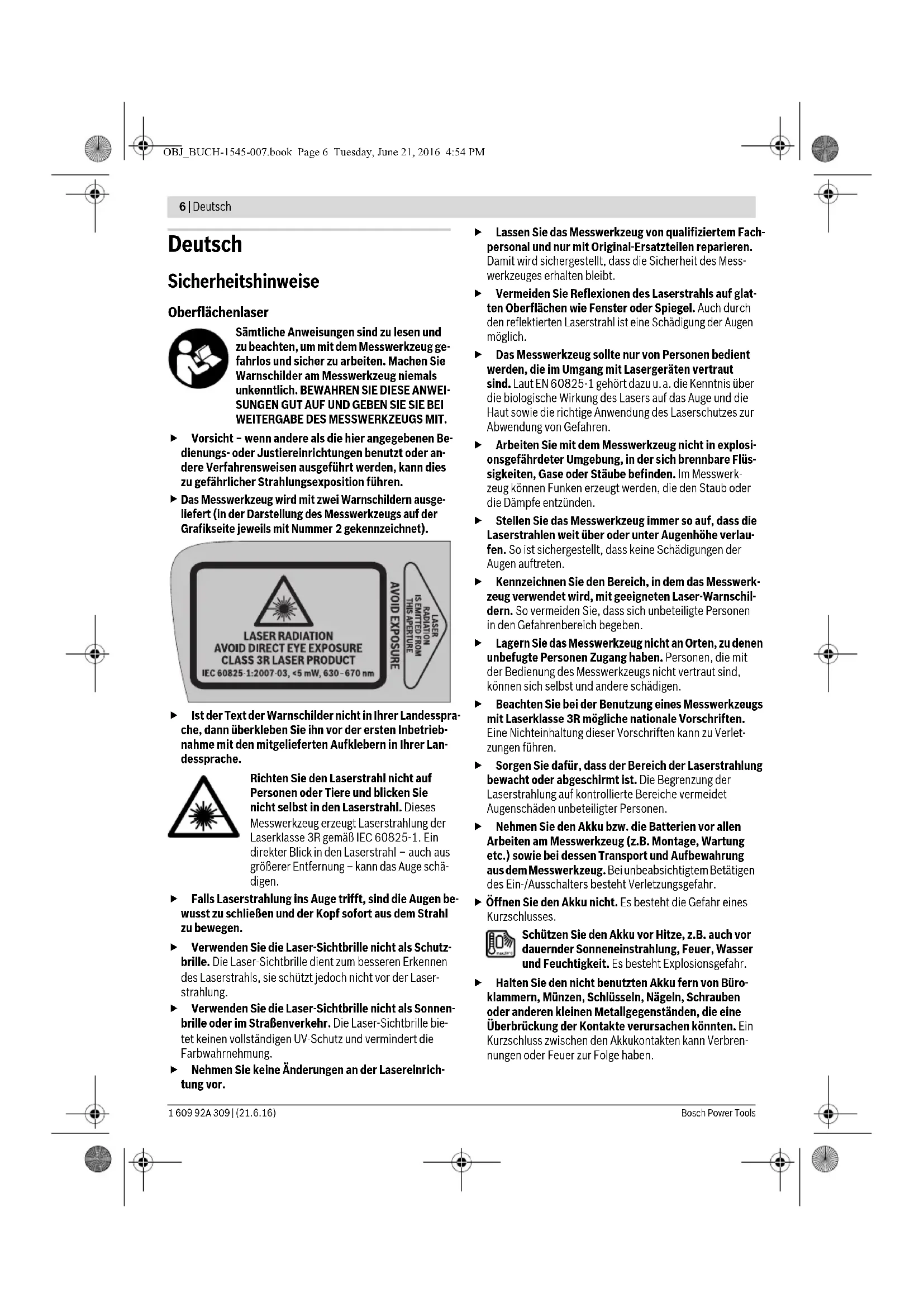 OBJ_BUCH-1545-007.book Page 5 Tuesday, June 21, 2016 4:54 PM6 | Deutsch 1 609 92A 309 | (21.6.16) Bosch Power Tools Deutsch Sicherheitshinweise Oberflächenlaser Sämtliche Anweisungen sind zu lesen und zu beachten, um mit dem Messwerkzeug ge- fahrlos und sicher zu arbeiten. Machen Sie Warnschilder am Messwerkzeug niemals unkenntlich. BEWAHREN SIE DIESE ANWEI- SUNGEN GUT AUF UND GEBEN SIE SIE BEI WEITERGABE DES MESSWERKZEUGS MIT. Vorsicht – wenn andere als die hier angegebenen Be- dienungs- oder Justiereinrichtungen benutzt oder an- dere Verfahrensweisen ausgeführt werden, kann dies zu gefährlicher Strahlungsexposition führen.