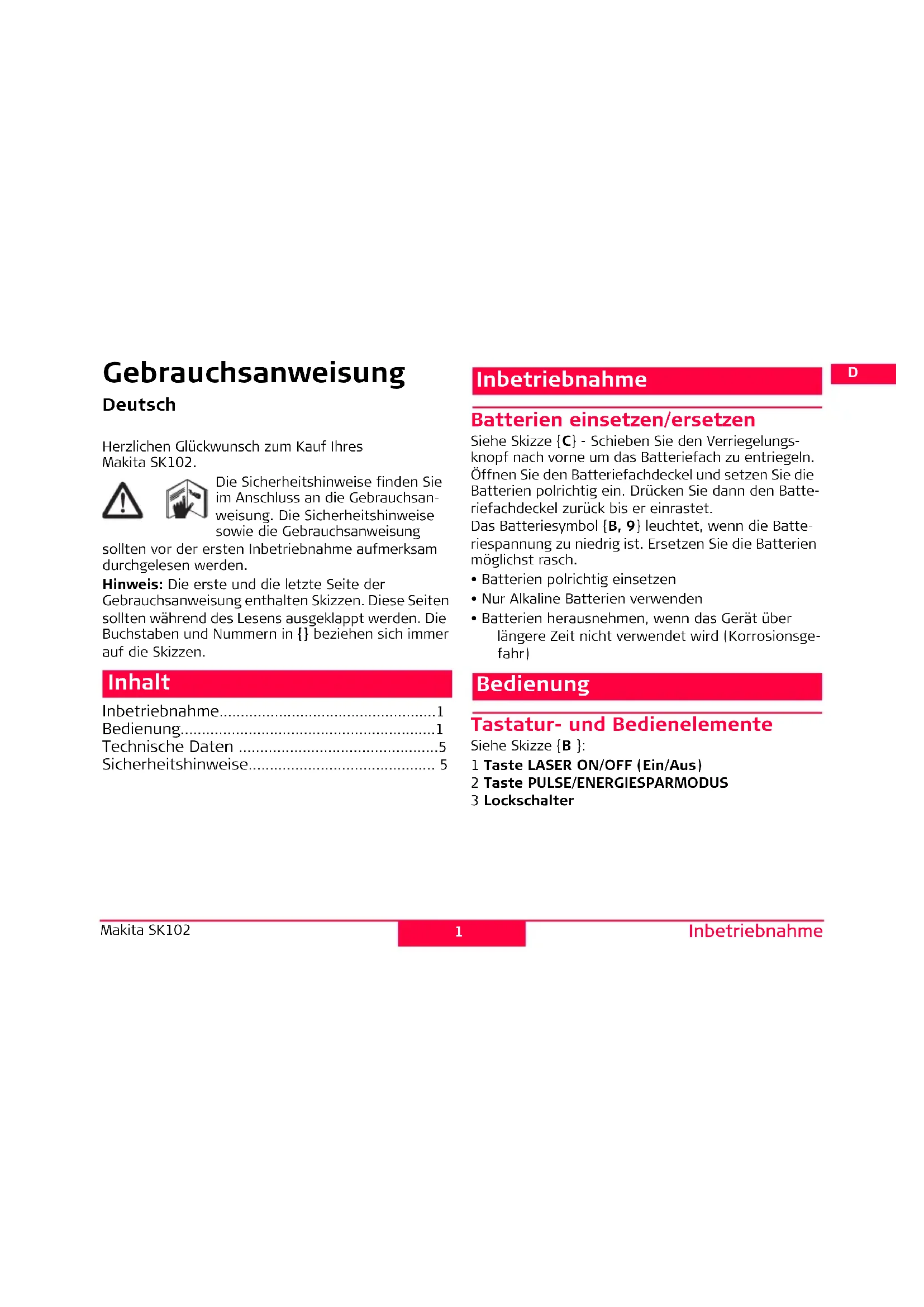 Herzlichen Glückwunsch zum Kauf Ihres Makita SK102.
