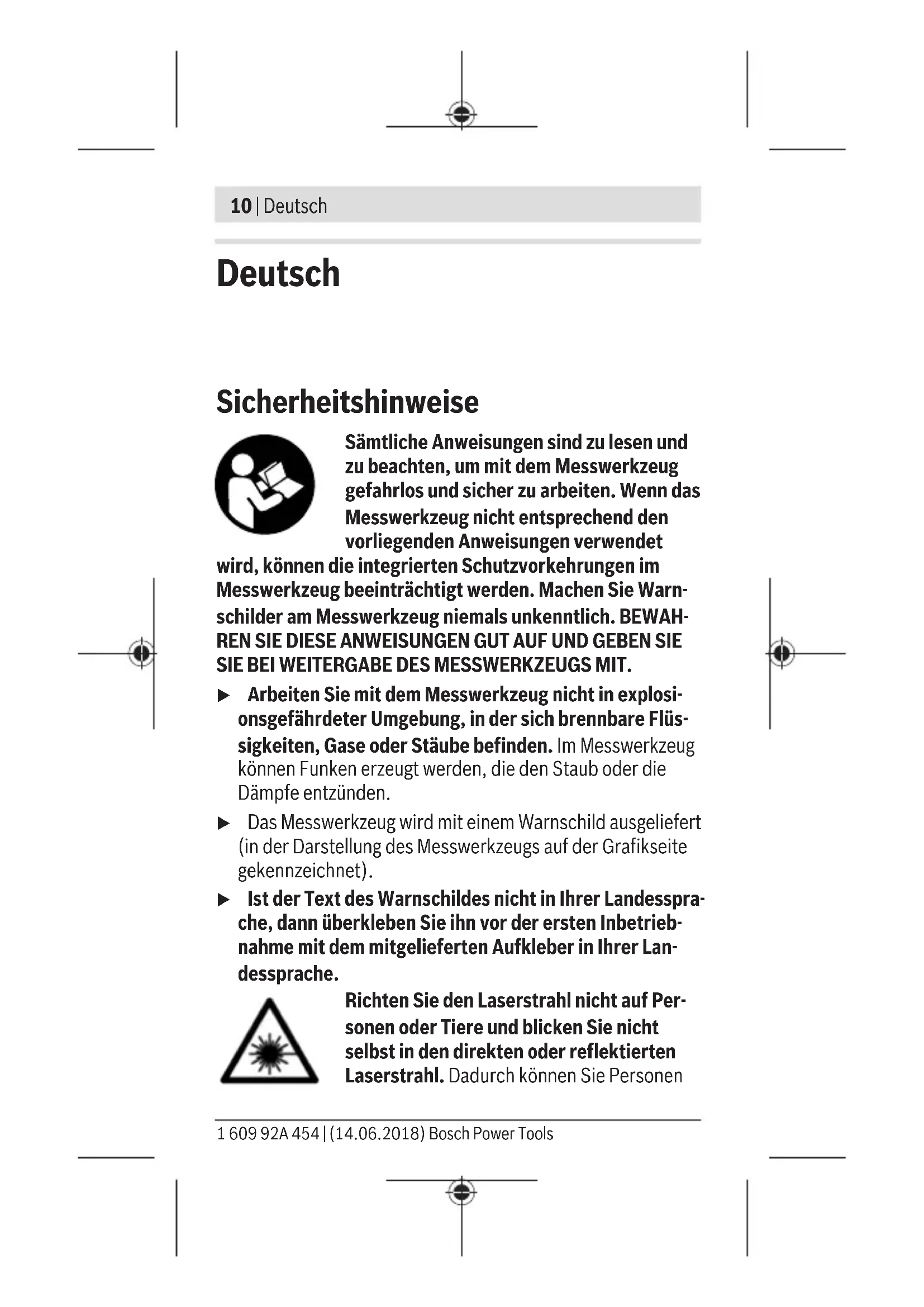 K210 | Deutsch 1 609 92A 454 | (14.06.2018) Bosch Power Tools Deutsch Sicherheitshinweise Sämtliche Anweisungen sind zu lesen und zu beachten, um mit dem Messwerkzeug gefahrlos und sicher zu arbeiten. Wenn das Messwerkzeug nicht entsprechend den vorliegenden Anweisungen verwendet wird, können die integrierten Schutzvorkehrungen im Messwerkzeug beeinträchtigt werden. Machen Sie Warn- schilder am Messwerkzeug niemals unkenntlich. BEWAH- REN SIE DIESE ANWEISUNGEN GUT AUF UND GEBEN SIE SIE BEI WEITERGABE DES MESSWERKZEUGS MIT. u Arbeiten Sie mit dem Messwerkzeug nicht in explosi- onsgefährdeter Umgebung, in der sich brennbare Flüs- sigkeiten, Gase oder Stäube befinden. Im Messwerkzeug können Funken erzeugt werden, die den Staub oder die Dämpfe entzünden. u Das Messwerkzeug wird mit einem Warnschild ausgeliefert (in der Darstellung des Messwerkzeugs auf der Grafikseite gekennzeichnet). u Ist der Text des Warnschildes nicht in Ihrer Landesspra- che, dann überkleben Sie ihn vor der ersten Inbetrieb- nahme mit dem mitgelieferten Aufkleber in Ihrer Lan- dessprache. Richten Sie den Laserstrahl nicht auf Per- sonen oder Tiere und blicken Sie nicht selbst in den direkten oder reflektierten Laserstrahl. Dadurch können Sie Personenblenden, Unfälle verursachen oder das Auge schädigen. u Falls Laserstrahlung ins Auge trifft, sind die Augen be- wusst zu schließen und der Kopf sofort aus dem Strahl zu bewegen. u Nehmen Sie keine Änderungen an der Lasereinrichtung vor. u Lassen Sie das eingeschaltete Messwerkzeug nicht un- beaufsichtigt und schalten Sie das Messwerkzeug nach Gebrauch ab. Andere Personen könnten vom Laserstrahl geblendet werden. u Lassen Sie das Messwerkzeug nur von qualifiziertem Fachpersonal und nur mit Original-Ersatzteilen reparie- ren. Damit wird sichergestellt, dass die Sicherheit des Messwerkzeuges erhalten bleibt. u Lassen Sie Kinder das Laser-Messwerkzeug nicht unbe- aufsichtigt benutzen. Sie könnten unbeabsichtigt Perso- nen blenden. u Verwenden Sie die Laser-Sichtbrille nicht als Schutzbril- le. Die Laser-Sichtbrille dient zum besseren Erkennen des Laserstrahls; sie schützt jedoch nicht vor der Laserstrah- lung. u Verwenden Sie die Laser-Sichtbrille nicht als Sonnen- brille oder im Straßenverkehr. Die Laser-Sichtbrille bietet keinen vollständigen UV-Schutz und vermindert die Farb- wahrnehmung. u Vorsicht – wenn andere als die hier angegebenen Bedie- nungs- oder Justiereinrichtungen benutzt oder andere Verfahrensweisen ausgeführt werden, kann dies zu ge- fährlicher Strahlungsexposition führen. Deutsch | 11 Bosch Power Tools 1 609 92A 454 | (14.06.2018)12 | Deutsch 1 609 92A 454 | (14.06.2018) Bosch Power Tools Produkt- und Leistungsbeschreibung Bestimmungsgemäßer Gebrauch Digitaler Laser-Entfernungsmesser Das Messwerkzeug ist bestimmt zum Messen von Entfernun- gen, Längen, Höhen, Abständen und zum Berechnen von Flä- chen. Das Messwerkzeug ist geeignet zum Messen im Innenbe- reich. Laserlinien-Adapter Der Laserlinien-Adapter ist, in Verbindung mit dem digitalen Laser-Entfernungsmesser Zamo, zum senkrechten oder waa- gerechten Ausrichten (z. B. Bilder) im Innenbereich bestimmt. Band-Adapter Der Band-Adapter ist, in Verbindung mit dem digitalen Laser- Entfernungsmesser Zamo, zum Messen von Umfängen (z.B. Vase, Rohr usw.) und Längen freistehender Objekte (z.B. Fernseher, Regal usw.) im Innenbereich bestimmt. Rad-Adapter Der Rad-Adapter ist, in Verbindung mit dem digitalen Laser- Entfernungsmesser Zamo, zum Messen von Strecken zwi- schen zwei Punkten (z.B. Stofflänge) im Innenbereich be- stimmt. Abgebildete Komponenten Die Nummerierung der abgebildeten Komponenten bezieht sich auf die Darstellung des Messwerkzeugs auf der Grafiksei- te. (1) Messtaste (2) Display (3) Batteriefachdeckel (4) Arretierung des Batteriefachdeckels(5) Seriennummer (6) Laser-Warnschild (7) Empfangslinse (8) Ausgang Laserstrahlung (9) Abdeckkappe (10) Entriegelungstasten für Adapter Anzeigenelemente (a) Batteriewarnung (b) Temperaturwarnung (c) Adapter montiert (d) Laser eingeschaltet (e) Vorhergehender Messwert (f) Maßeinheit (g) Aktueller Messwert (h) Flächenmessung Laserlinien-Adapter