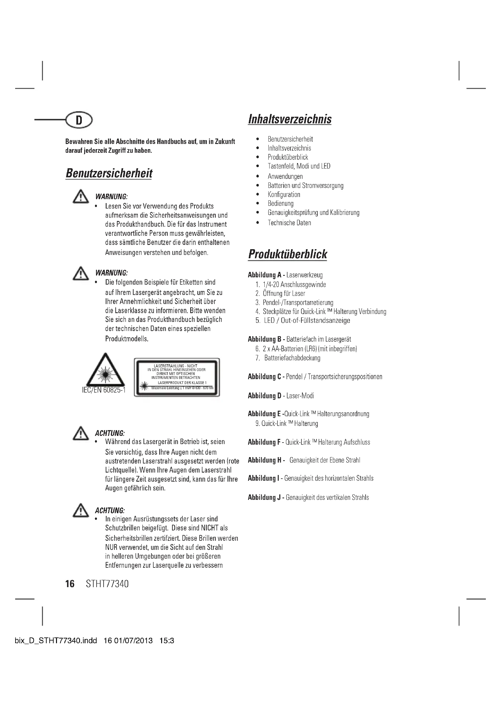- 0,5 mm ≤ 1.6 mm (WAHR, Gerät befindet sich innerhalb der Kalibrierungstoleranz) Cubix_D_STHT77340.indd 21 01/07/2013 15:3922 STHT77340 Technische Daten Lasergerät Cubix (STHT77340) Nivellierungsgenauigkeit: ± 8 mm / 10m (5/16in / 30 ft) Horizontale / Vertikale Genauigkeit ± 0,8 mm / 10m (5/16in / 30 ft) Kompensierungsbereich: ± 4° Arbeitsentfernung (Linie): 12 m (40ft) Laserklasse: Klasse 1 (IEC/EN60825-1) Laserwellenlänge: 630 nm ~ 670 nm Betriebsdauer (alle Laser EIN): 12 Stunden (Alkaline) Stromversorgung: 2 x “AA” (LR6) IP Schutzgrad: IP50 Betriebstemperatur: -10° C ~ +40° C (14°F ~ 104°F) Lagertemperatur: -25° C ~ +70° C Cubix_D_STHT77340.indd 22 01/07/2013 15:39STHT77340
