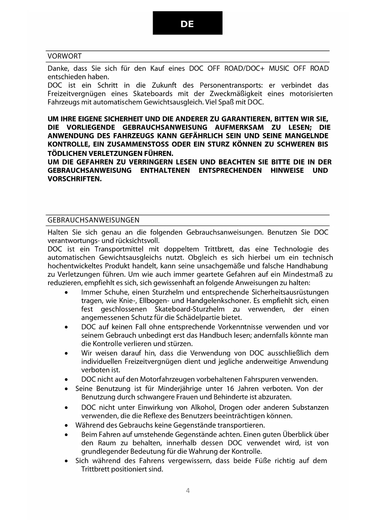 VORWORT Danke, dass Sie sich für den Kauf eines DOC OFF ROAD/DOC+ MUSIC OFF ROAD entschieden haben. DOC ist ein Schritt in die Zukunft des Personentransports: er verbindet das Freizeitvergnügen eines Skateboards mit der Zweckmäßigkeit eines motorisierten Fahrzeugs mit automatischem Gewichtsausgleich. Viel Spaß mit DOC.